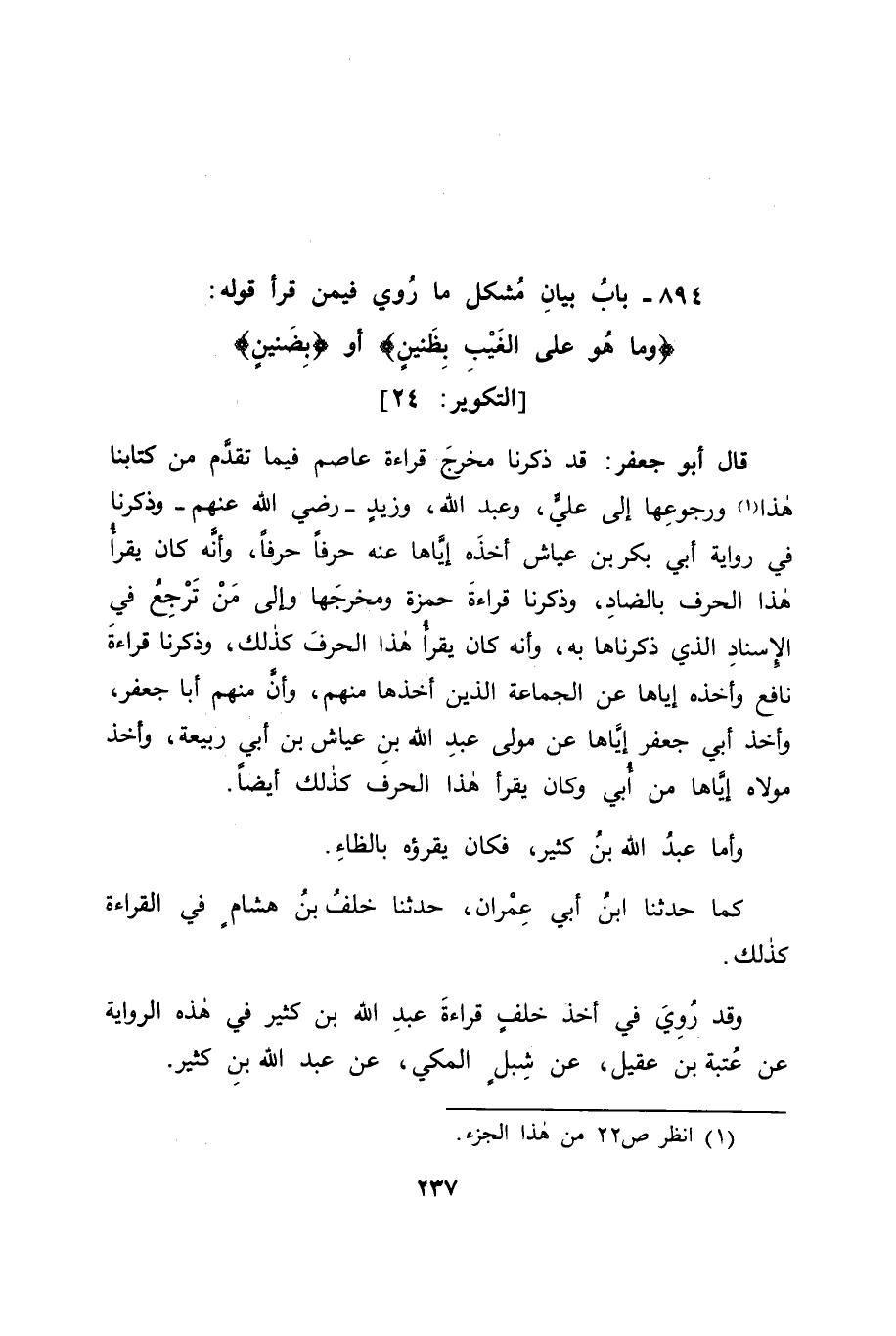 بَابُ بَيَانِ مُشْكِلِ مَا رُوِيَ فِيمَنْ قَرَأَ قَوْلَهُ: (وَمَا هُوَ عَلَى الْغَيْبِ بِظَنِينٍ) أَوْ {بِضَنِينٍ} [التكوير: 24] قَالَ أَبُو جَعْفَرٍ: قَدْ ذَكَرْنَا مَخْرَجَ قِرَاءَةِ عَاصِمٍ فِيمَا تَقَدَّمَ مِنْ كِتَابِنَا هَذَا، وَرُجُوعَهَا إِلَى عَلِيٍّ، وَعَبْدِ اللهِ، وَزَيْدٍ رَضِيَ اللهُ عَنْهُمْ، وَذَكَرْنَا فِي رِوَايَةِ أَبِي بَكْرِ بْنِ عَيَّاشٍ أَخْذَهُ إِيَّاهَا عَنْهُ حَرْفًا حَرْفًا، وَأَنَّهُ كَانَ يَقْرَأُ هَذَا الْحَرْفَ بِالضَّادِ، وَذَكَرْنَا قِرَاءَةَ حَمْزَةَ وَمَخْرَجَهَا , وَإِلَى مَنْ تَرْجِعُ فِي الْإِسْنَادِ الَّذِي ذَكَرْنَاهَا بِهِ، وَأَنَّهُ كَانَ يَقْرَأُ هَذَا الْحَرْفَ كَذَلِكَ، وَذَكَرْنَا قِرَاءَةَ نَافِعٍ، وَأَخْذَهُ إِيَّاهَا عَنِ الْجَمَاعَةِ الَّذِينَ أَخَذَهَا مِنْهُمْ، وَأَنَّ مِنْهُمْ أَبَا جَعْفَرٍ، وَأَخْذَ أَبِي جَعْفَرٍ إِيَّاهَا عَنْ مَوْلَى عَبْدِ اللهِ بْنِ عَيَّاشِ بْنِ أَبِي رَبِيعَةَ، وَأَخْذَ مَوْلَاهُ إِيَّاهَا مِنْ أُبَيٍّ، وَكَانَ يَقْرَأُ هَذَا الْحَرْفَ كَذَلِكَ أَيْضًا. وَأَمَّا عَبْدُ اللهِ بْنُ كَثِيرٍ، فَكَانَ يَقْرَؤُهُ بِالظَّاءِ , كَمَا حَدَّثَنَا ابْنُ أَبِي عِمْرَانَ، حَدَّثَنَا خَلَفُ بْنُ هِشَامٍ، فِي الْقِرَاءَةِ كَذَلِكَ. وَقَدْ رُوِيَ فِي أَخْذِ خَلْفٍ قِرَاءَةَ عَبْدِ اللهِ بْنِ كَثِيرٍ فِي هَذِهِ الرِّوَايَةِ عَنْ عُتْبَةَ بْنِ عَقِيلٍ، عَنْ شِبْلٍ الْمَكِّيِّ، عَنْ عَبْدِ اللهِ بْنِ كَثِيرٍ.