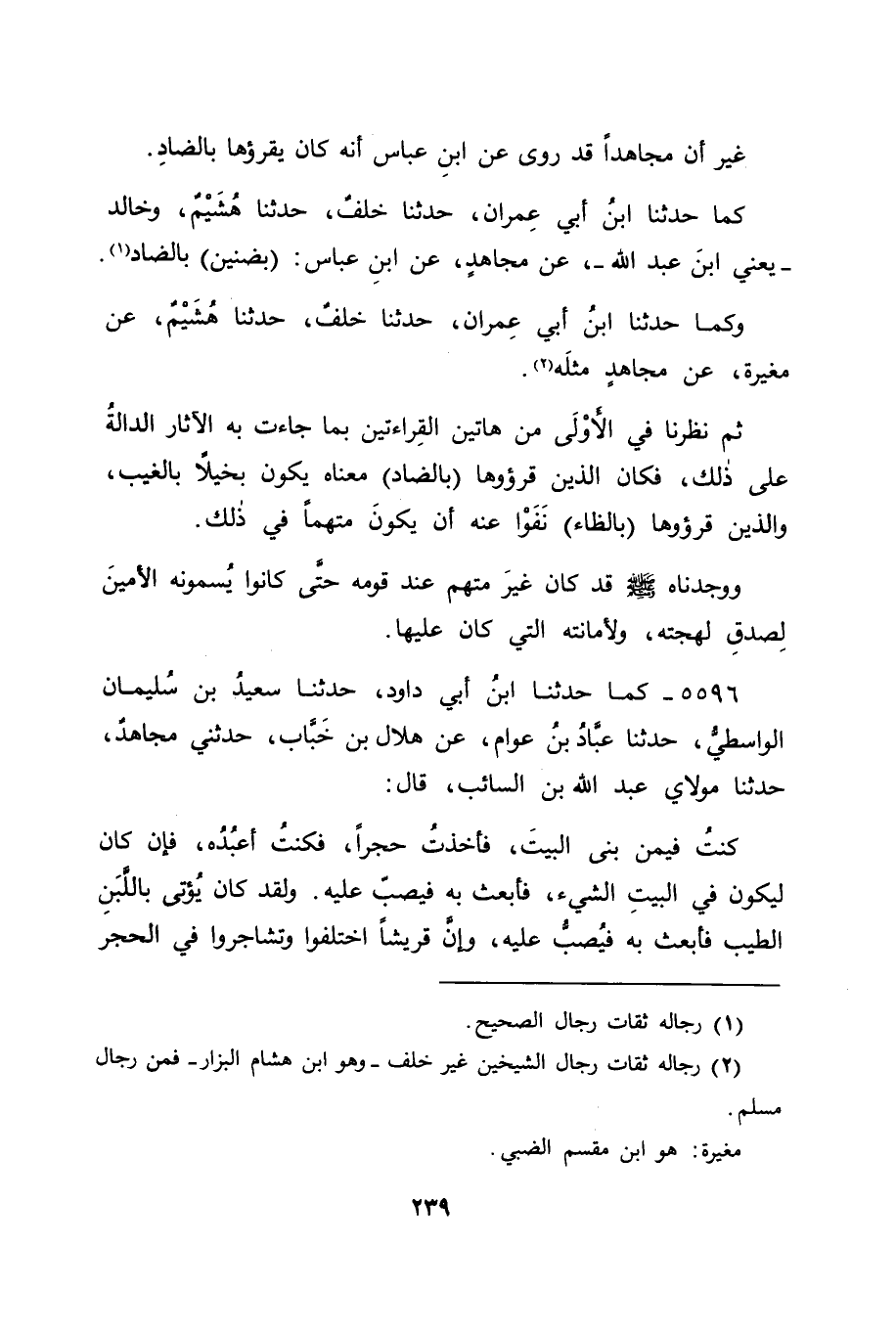 كَمَا حَدَّثَنَا ابْنُ أَبِي عِمْرَانَ، حَدَّثَنَا خَلَفٌ، حَدَّثَنَا هُشَيْمٌ، وَخَالِدٌ يَعْنِي ابْنَ عَبْدِ اللهِ، عَنْ مُجَاهِدٍ، عَنِ ابْنِ عَبَّاسٍ: {بِضَنِينٍ} [التكوير: 24] بِالضَّادِ ". وَكَمَا حَدَّثَنَا ابْنُ أَبِي عِمْرَانَ، حَدَّثَنَا خَلَفٌ، حَدَّثَنَا هُشَيْمٌ، عَنْ مُغِيرَةَ، عَنْ مُجَاهِدٍ، مِثْلَهُ. ثُمَّ نَظَرْنَا فِي الْأَوْلَى مِنْ هَاتَيْنِ الْقِرَاءَتَيْنِ بِمَا جَاءَتْ بِهِ الْآثَارُ الدَّالَّةُ عَلَى ذَلِكَ، فَكَانَ الَّذِينَ قَرَءُوهَا بِالضَّادِ مَعْنَاهُ يَكُونُ: بَخِيلًا بِالْغَيْبِ، وَالَّذِينَ قَرَءُوهَا بِالظَّاءِ نَفَوْا عَنْهُ أَنْ يَكُونَ مُتَّهَمًا فِي ذَلِكَ، وَوَجَدْنَاهُ صَلَّى اللَّهُ عَلَيْهِ وَسَلَّمَ قَدْ كَانَ غَيْرَ مُتَّهَمٍ عِنْدَ قَوْمِهِ حَتَّى كَانُوا يُسَمُّونَهُ الْأَمِينَ , لِصِدْقِ لَهْجَتِهِ، وَلِأَمَانَتِهِ الَّتِي كَانَ عَلَيْهَا