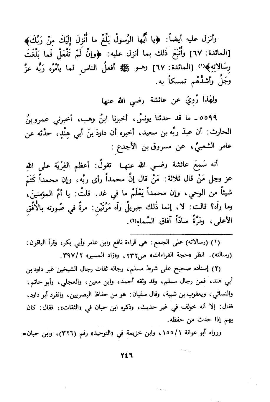 5599 - مَا قَدْ حَدَّثَنَا يُونُسُ، أَخْبَرَنَا ابْنُ وَهْبٍ، أَخْبَرَنِي عَمْرُو بْنُ الْحَارِثِ، أَنَّ عَبْدَ رَبِّهِ بْنَ سَعِيدٍ، أَخْبَرَهُ أَنَّ دَاوُدَ بْنَ أَبِي هِنْدٍ، حَدَّثَهُ عَنْ عَامِرٍ الشَّعْبِيِّ، عَنْ مَسْرُوقِ بْنِ الْأَجْدَعِ، أَنَّهُ سَمِعَ عَائِشَةَ، رَضِيَ اللهُ عَنْهَا تَقُولُ: " أَعْظَمُ الْفِرْيَةِ عَلَى اللهِ عَزَّ وَجَلَّ مَنْ قَالَ ثَلَاثَةً: مَنْ قَالَ: إِنَّ مُحَمَّدًا رَأَى رَبَّهُ، وَإِنَّ مُحَمَّدًا كَتَمَ شَيْئًا مِنَ الْوَحْيِ، وَإِنَّ مُحَمَّدًا يَعْلَمُ مَا فِي غَدٍ، قُلْتُ: يَا أُمَّ الْمُؤْمِنِينَ، وَمَا رَآهُ؟ قَالَتْ: لَا، إِنَّمَا ذَلِكَ جِبْرِيلُ , رَآهُ مَرَّتَيْنِ: مَرَّةً فِي صُورَتِهِ بِالْأُفُقِ الْأَعْلَى، وَمَرَّةً سَادًّا آفَاقَ السَّمَاءِ " -[247]-