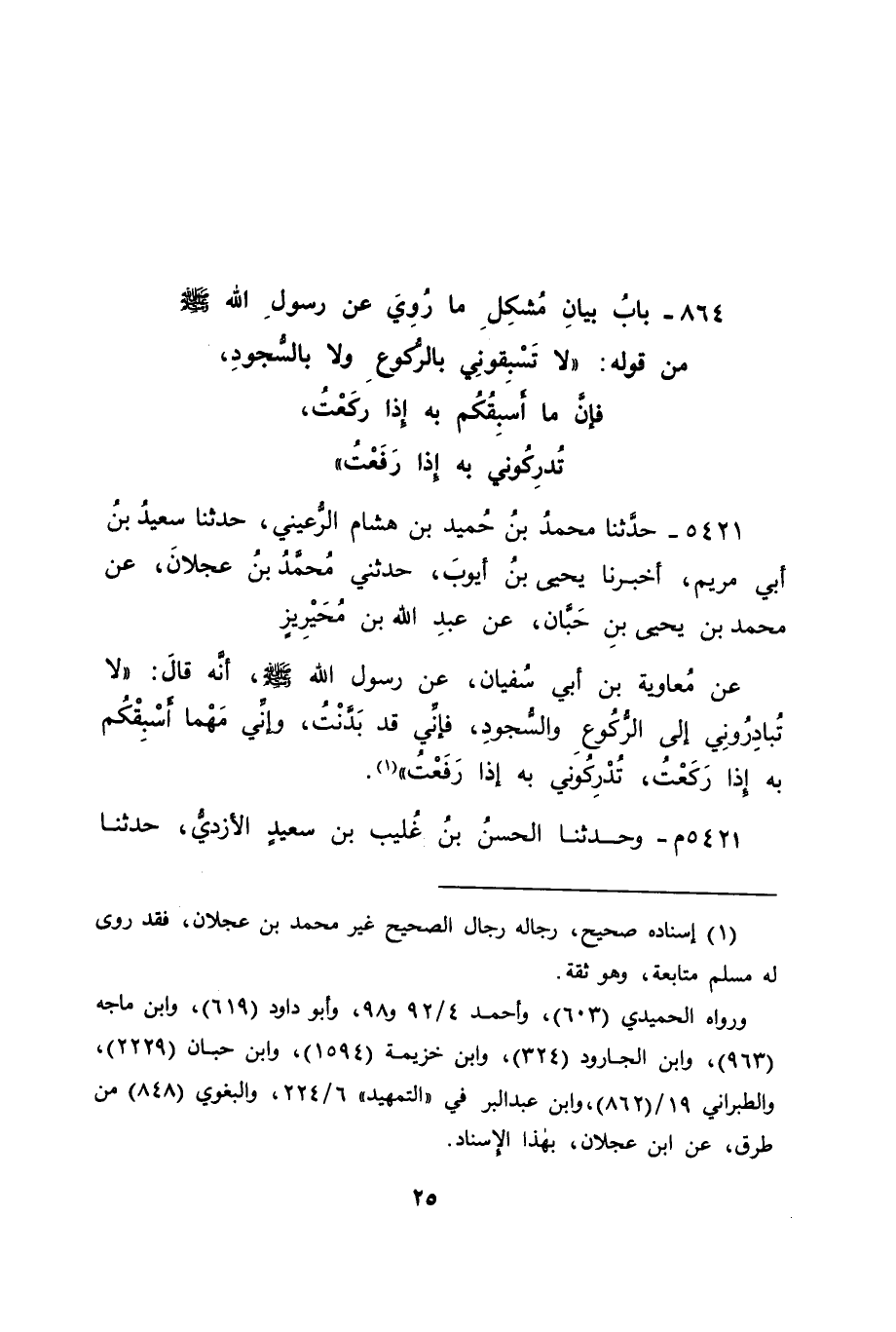5421 - حَدَّثَنَا مُحَمَّدُ بْنُ حُمَيْدِ بْنِ هِشَامٍ الرُّعَيْنِيُّ، حَدَّثَنَا سَعِيدُ بْنُ أَبِي مَرْيَمَ، أَخْبَرَنَا يَحْيَى بْنُ أَيُّوبَ، حَدَّثَنِي مُحَمَّدُ بْنُ عَجْلَانَ، عَنْ مُحَمَّدِ بْنِ يُحْيِي بْنِ حَبَّانَ، عَنْ عَبْدِ اللهِ بْنِ مُحَيْرِيزٍ، عَنْ مُعَاوِيَةَ بْنِ أَبِي سُفْيَانَ، عَنْ رَسُولِ اللهِ صَلَّى اللَّهُ عَلَيْهِ وَسَلَّمَ أَنَّهُ قَالَ: " لَا تُبَادِرُونِي إِلَى الرُّكُوعِ وَالسُّجُودِ، فَإِنِّي قَدْ بَدَّنْتُ، وَإِنِّي مَهْمَا أَسْبِقْكُمْ بِهِ إِذَا رَكَعْتُ، تُدْرِكُونِي بِهِ إِذَا رَفَعْتُ "
