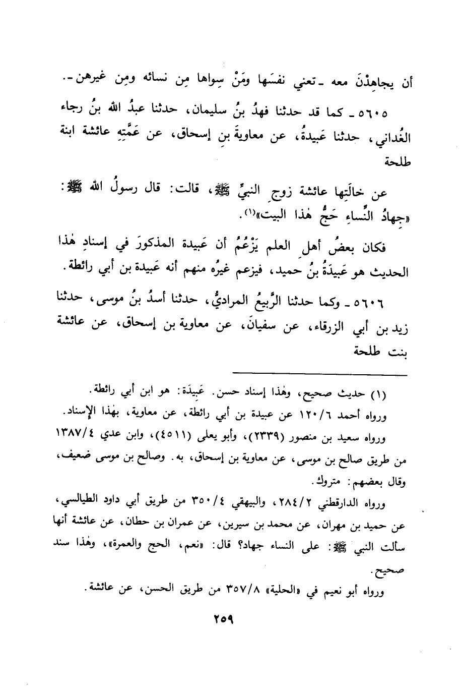 5605 - كَمَا قَدْ حَدَّثَنَا فَهْدُ بْنُ سُلَيْمَانَ، حَدَّثَنَا عَبْدُ اللهِ بْنُ رَجَاءٍ الْغُدَانِيُّ، حَدَّثَنَا عَبِيدَةُ، عَنْ مُعَاوِيَةَ بْنِ إِسْحَاقَ، عَنْ عَمَّتِهِ عَائِشَةَ ابْنَةِ طَلْحَةَ، عَنْ خَالَتِهَا عَائِشَةَ زَوْجِ النَّبِيِّ صَلَّى اللَّهُ عَلَيْهِ وَسَلَّمَ قَالَتْ: قَالَ رَسُولُ اللهِ صَلَّى اللَّهُ عَلَيْهِ وَسَلَّمَ: " جِهَادُ النِّسَاءِ حَجُّ هَذَا الْبَيْتِ " فَكَانَ بَعْضُ أَهْلِ الْعِلْمِ يَزْعُمُ أَنَّ عَبِيدَةَ الْمَذْكُورَ فِي إِسْنَادِ هَذَا الْحَدِيثِ هُوَ عَبِيدَةُ بْنُ حُمَيْدٍ، فَيَزْعُمُ غَيْرُهُ مِنْهُمْ أَنَّهُ عَبِيدَةُ بْنُ أَبِي رَائِطَةَ