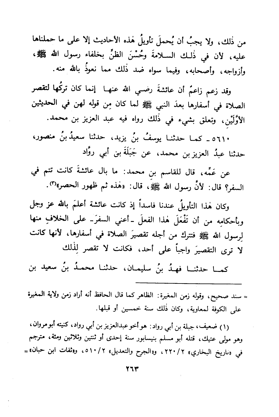 5610 - كَمَا حَدَّثَنَا يُوسُفُ بْنُ يَزِيدَ، حَدَّثَنَا سَعِيدُ بْنُ مَنْصُورٍ، حَدَّثَنَا عَبْدُ الْعَزِيزِ بْنُ مُحَمَّدٍ، عَنْ جَبَلَةَ بْنِ أَبِي رَوَّادٍ، عَنْ عَمِّهِ قَالَ لِلْقَاسِمِ بْنِ مُحَمَّدٍ: مَا بَالُ عَائِشَةَ كَانَتْ تُتِمُّ فِي السَّفَرِ؟ قَالَ: لِأَنَّ رَسُولَ اللهِ صَلَّى اللَّهُ عَلَيْهِ وَسَلَّمَ قَالَ: " هَذِهِ ثُمَّ ظُهُورَ الْحُصُرِ " وَكَانَ هَذَا التَّأْوِيلُ عِنْدَنَا فَاسِدًا إِذْ كَانَتْ عَائِشَةُ أَعْلَمَ بِاللهِ عَزَّ وَجَلَّ، وَبِأَحْكَامِهِ مِنْ أَنْ تَفْعَلَ هَذَا الْفِعْلَ - أَعْنِي السَّفَرَ - عَلَى الْخِلَافِ مِنْهَا لِرَسُولِ اللهِ صَلَّى اللَّهُ عَلَيْهِ وَسَلَّمَ , فَتَتْرُكَ مِنْ أَجْلِهِ تَقْصِيرَ الصَّلَاةِ فِي أَسْفَارِهَا، لِأَنَّهَا كَانَتْ لَا تَرَى التَّقْصِيرَ وَاجِبًا عَلَى أَحَدٍ، فَكَانَتْ لَا تَقْصُرُ لِذَلِكَ