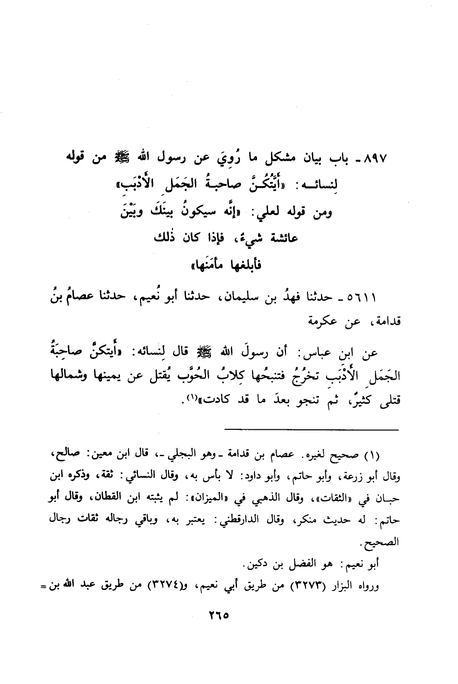 5611 - حَدَّثَنَا فَهْدُ بْنُ سُلَيْمَانَ، حَدَّثَنَا أَبُو نُعَيْمٍ، حَدَّثَنَا عِصَامُ بْنُ قُدَامَةَ، عَنْ عِكْرِمَةَ، عَنِ ابْنِ عَبَّاسٍ، أَنَّ رَسُولَ اللهِ صَلَّى اللَّهُ عَلَيْهِ وَسَلَّمَ قَالَ لِنِسَائِهِ: " أَيَّتُكُنَّ صَاحِبَةُ الْجَمَلِ الْأَدْبَبِ , تَخْرُجُ فَتَنْبَحُهَا كِلَابُ الْحُوَّبِ، يُقْتَلُ عَنْ يَمِينِهَا وَشِمَالِهَا قَتْلَى كَثِيرٌ، ثُمَّ تَنْجُو بَعْدَمَا قَدْ كَادَتْ " -[266]- قَالَ: أَبُو جَعْفَرٍ: هَكَذَا يَقُولُ أَهْلُ الْحَدِيثِ فِي هَذَا الْمَوْضِعِ الْمَذْكُورِ نُبَاحُ الْكِلَابِ فِيهِ: الْحُوَّبُ بِالرَّفْعِ، وَأَمَّا أَهْلُ الْعَرَبِيَّةِ، فَيَقُولُونَ جَمِيعًا بِالْفَتْحِ، وَيُنْشِدُونَ فِي ذَلِكَ: