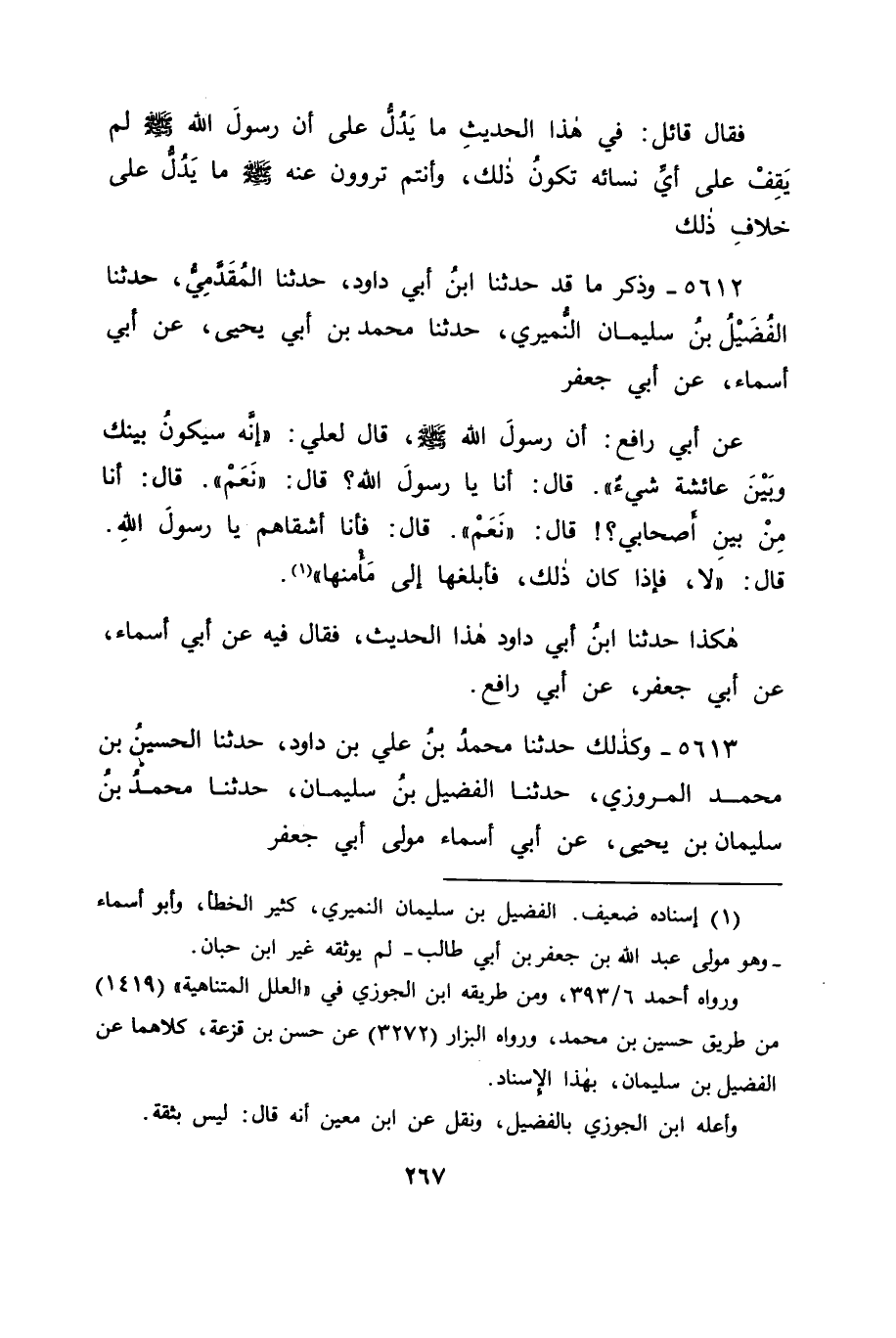 5612 - وَذَكَرَ مَا قَدْ حَدَّثَنَا ابْنُ أَبِي دَاوُدَ، حَدَّثَنَا الْمُقَدَّمِيُّ، حَدَّثَنَا الْفُضَيْلُ بْنُ سُلَيْمَانَ النُّمَيْرِيُّ، حَدَّثَنَا مُحَمَّدُ بْنُ أَبِي يَحْيَى، عَنْ أَبِي أَسْمَاءٍ، عَنْ أَبِي جَعْفَرٍ، عَنْ أَبِي رَافِعٍ، أَنَّ رَسُولَ اللهِ صَلَّى اللَّهُ عَلَيْهِ وَسَلَّمَ قَالَ لِعَلِيٍّ: " إِنَّهُ سَيَكُونُ بَيْنَكَ وَبَيْنَ عَائِشَةَ شَيْءٌ " قَالَ: أَنَا يَا رَسُولَ اللهِ؟ قَالَ: " نَعَمْ " قَالَ: أَنَا مِنْ بَيْنِ أَصْحَابِي؟ قَالَ: " نَعَمْ " قَالَ: فَأَنَا أَشْقَاهُمْ يَا رَسُولَ اللهِ , قَالَ: " لَا، فَإِذَا كَانَ ذَلِكَ، فَأَبْلِغْهَا إِلَى مَأْمَنَهَا " هَكَذَا حَدَّثَنَا ابْنُ أَبِي دَاوُدَ هَذَا الْحَدِيثَ، فَقَالَ فِيهِ: عَنْ أَبِي أَسْمَاءٍ، عَنْ أَبِي جَعْفَرٍ، عَنْ أَبِي رَافِعٍ