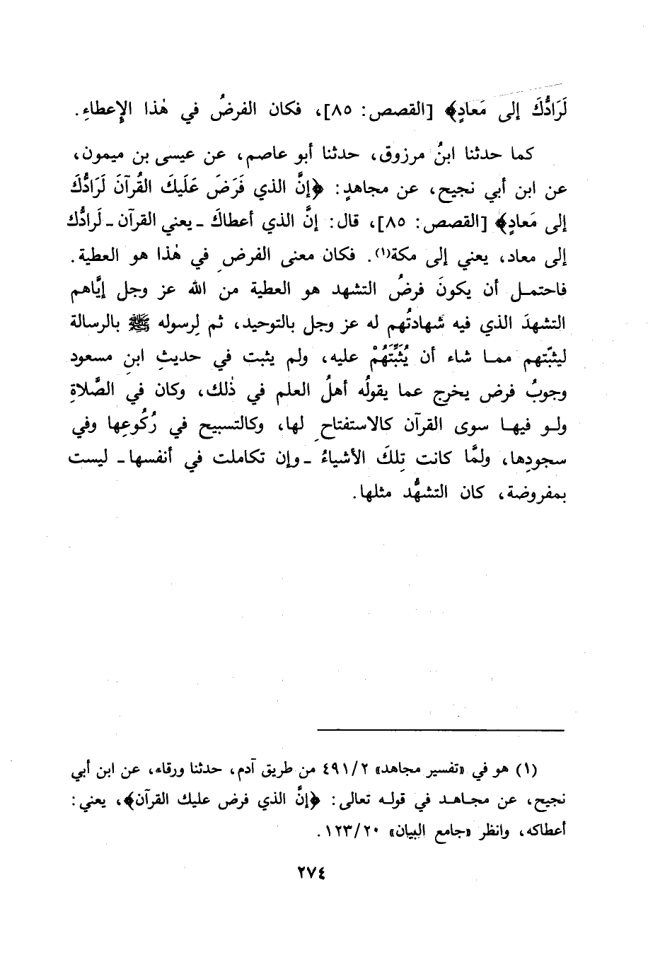 كَمَا حَدَّثَنَا ابْنُ مَرْزُوقٍ، حَدَّثَنَا أَبُو عَاصِمٍ، عَنْ عِيسَى بْنِ مَيْمُونٍ، عَنِ ابْنِ أَبِي نَجِيحٍ، عَنْ مُجَاهِدٍ: " {إِنَّ الَّذِي فَرَضَ عَلَيْكَ الْقُرْآنَ لَرَادُّكَ إِلَى مَعَادٍ} [القصص: 85] قَالَ: إِنَّ الَّذِي أَعْطَاكَ - يَعْنِي الْقُرْآنَ - لَرَادُّكَ إِلَى مَعَادٍ، يَعْنِي إِلَى مَكَّةَ " فَكَانَ مَعْنَى الْفَرْضِ فِي هَذَا هُوَ الْعَطِيَّةَ، فَاحْتُمِلَ أَنْ يَكُونَ فَرْضُ التَّشَهُّدِ هُوَ الْعَطِيَّةَ مِنَ اللهِ عَزَّ وَجَلَّ إِيَّاهُمُ التَّشَهُّدَ الَّذِي فِيهِ شَهَادَتُهُمْ لَهُ عَزَّ وَجَلَّ بِالتَّوْحِيدِ، ثُمَّ لِرَسُولِ اللهِ صَلَّى اللَّهُ عَلَيْهِ وَسَلَّمَ بِالرِّسَالَةِ لِيُثَبِّتَهُمْ مِمَّا شَاءَ أَنْ يُثَبِّتَهُمْ عَلَيْهِ، وَلَمْ يَثْبُتْ فِي حَدِيثِ ابْنِ مَسْعُودٍ وُجُوبُ فَرْضٍ يَخْرُجُ عَمَّا يَقُولُهُ أَهْلُ الْعِلْمِ فِي ذَلِكَ، وَكَانَ فِي الصَّلَاةِ , وَلَوْ فِيهَا سِوَى الْقُرْآنِ كَالِاسْتِفْتَاحِ لَهَا، وَكَالتَّسْبِيحِ فِي رُكُوعِهَا، وَفِي سُجُودِهَا، وَلَمَّا كَانَتْ تِلْكَ الْأَشْيَاءُ - وَإِنْ تَكامَلَتْ فِي أَنْفُسِهَا - لَيْسَتْ بِمَفْرُوضَةٍ، كَانَ التَّشَهُّدُ مِثْلَهَا