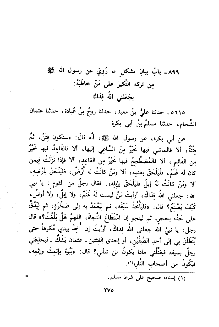 5615 - حَدَّثَنَا عَلِيُّ بْنُ مَعْبَدٍ، حَدَّثَنَا رَوْحُ بْنُ عُبَادَةَ، حَدَّثَنَا عُثْمَانُ الشَّحَّامُ، حَدَّثَنَا مُسْلِمُ بْنُ أَبِي بَكْرَةَ، عَنْ أَبِي بَكْرَةَ، عَنْ رَسُولِ اللهِ صَلَّى اللَّهُ عَلَيْهِ وَسَلَّمَ أَنَّهُ قَالَ: " سَتَكُونُ فِتَنٌ، ثُمَّ فِتْنَةٌ، أَلَا فَالْمَاشِي فِيهَا خَيْرٌ مِنَ السَّاعِي إِلَيْهَا، أَلَا فَالْقَاعِدُ فِيهَا خَيْرٌ مِنَ الْقَائِمِ، أَلَا فَالْمُضْطَجِعُ فِيهَا خَيْرٌ مِنَ الْقَاعِدِ، أَلَا فَإِذَا نَزَلَتْ فِيمَنْ كَانَ لَهُ غَنَمٌ، فَلْيَلْحَقْ بِغَنَمِهِ، أَلَا وَمَنْ كَانَتْ لَهُ أَرْضٌ، فَلْيَلْحَقْ بِأَرْضِهِ، أَلَا وَمَنْ كَانَتْ لَهُ إِبِلٌ فَلْيَلْحَقْ بِإِبِلِهِ "، فَقَالَ رَجُلٌ مِنَ الْقَوْمِ: يَا نَبِيَّ اللهِ، جَعَلَنِي اللهُ فِدَاكَ، أَرَأَيْتَ مَنْ لَيْسَتْ لَهُ غَنَمٌ، وَلَا إِبِلٌ، وَلَا أَرْضٌ، كَيْفَ يَصْنَعُ؟ قَالَ: " فَلْيَأْخُذْ سَيْفَهُ، ثُمَّ لْيَعْمِدْ بِهِ إِلَى صَخْرَةٍ، ثُمَّ لْيَدُقَّ عَلَى حَدِّهِ بِحَجَرٍ، ثُمَّ لِيَنْجُو إِنِ اسْتَطَاعَ النَّجَاةَ، اللهُمَّ هَلْ بَلَّغْتُ؟ " قَالَ رَجُلٌ: يَا نَبِيَّ اللهِ، جَعَلَنِي اللهُ فِدَاكَ، أَرَأَيْتَ إِنْ أُخِذَ بِيَدِي مُكْرَهًا حَتَّى يُنْطَلَقَ بِي إِلَى أَحَدِ الصَّفَّيْنِ، أَوْ إِحْدَى الْفِئَتَيْنِ - عُثْمَانُ يَشُكُّ - فَيَحْذِفَنِي رَجُلٌ بِسَيْفِهِ فَيَقْتُلَنِي، مَاذَا يَكُونُ مِنْ شَأْنِي؟ قَالَ: " يَبُوءُ بِإِثْمِكَ وَإِثْمِهِ، فَيَكُونُ مِنْ أَصْحَابِ النَّارِ "