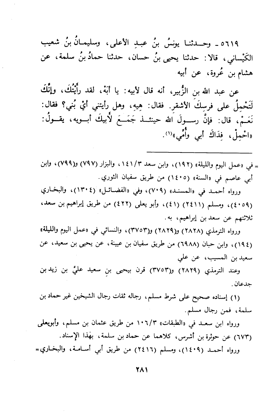 5619 - وَحَدَّثَنَا يُونُسُ بْنُ عَبْدِ الْأَعْلَى، وَسُلَيْمَانُ بْنُ شُعَيْبٍ الْكَيْسَانِيُّ قَالَا: حَدَّثَنَا يَحْيَى بْنُ حَسَّانَ، حَدَّثَنَا حَمَّادُ بْنُ سَلَمَةَ، عَنْ هِشَامِ بْنِ عُرْوَةَ، عَنْ أَبِيهِ، عَنْ عَبْدِ اللهِ بْنِ الزُّبَيْرِ، أَنَّهُ قَالَ لِأَبِيهِ: يَا أَبَهْ، لَقَدْ رَأَيْتُكَ، وَإِنَّكَ لَتَحْمِلُ عَلَى فَرَسِكَ الْأَشْقَرِ، فَقَالَ: هِيهِ، وَهَلْ رَأَيْتَنِي أَيْ بُنَيَّ؟ فَقَالَ: نَعَمْ قَالَ: فَإِنَّ رَسُولَ اللهِ حِينَئِذٍ جَمَعَ لِأَبِيكَ أَبَوَيْهِ يَقُولُ: " احْمِلْ، فِدَاكَ أَبِي وَأُمِّي "