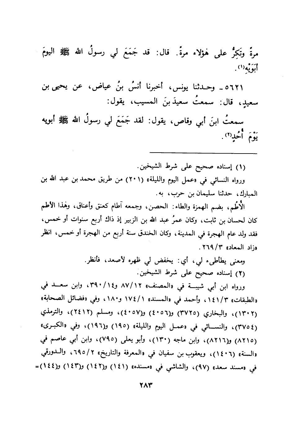 5621 - وَحَدَّثَنَا يُونُسُ، أَخْبَرَنَا أَنَسُ بْنُ عِيَاضٍ، عَنْ يَحْيَى بْنِ سَعِيدٍ قَالَ: سَمِعْتُ سَعِيدَ بْنَ الْمُسَيِّبِ يَقُولُ: سَمِعْتُ ابْنَ أَبِي وَقَّاصٍ يَقُولُ: " لَقَدْ جَمَعَ لِي رَسُولُ اللهِ صَلَّى اللَّهُ عَلَيْهِ وَسَلَّمَ أَبَوَيْهِ يَوْمَ أُحُدٍ "