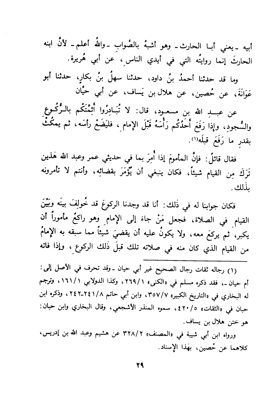 وَمَا قَدْ حَدَّثَنَا أَحْمَدُ بْنُ دَاوُدَ، حَدَّثَنَا سَهْلُ بْنُ بَكَّارٍ، حَدَّثَنَا أَبُو عَوَانَةَ، عَنْ حُصَيْنٍ، عَنْ هِلَالِ بْنِ يَسَافٍ، عَنْ أَبِي حَيَّانَ، عَنْ عَبْدِ اللهِ بْنِ مَسْعُودٍ قَالَ: " لَا تُبَادِرُوا أَئِمَّتَكُمْ بِالرُّكُوعِ وَالسُّجُودِ، وَإِذَا رَفَعَ أَحَدُكُمْ رَأْسَهُ قَبْلَ الْإِمَامِ، فَلْيَضَعْ رَأْسَهُ، ثُمَّ يَمْكُثْ بِقَدْرِ مَا رَفَعَ قَبْلَهُ " فَقَالَ قَائِلٌ: فَإِنَّ الْمَأْمُومَ إِذَا أُمِرَ بِمَا فِي حَدِيثَيْ عُمَرَ، وَعَبْدِ اللهِ هَذَيْنِ تَرَكَ مِنَ الْقِيَامِ شَيْئًا، فَكَانَ يَنْبَغِي أَنْ يُؤْمَرَ بِقَضَائِهِ، وَأَنْتُمْ لَا تَأْمُرُونَهُ بِذَلِكَ، فَكَانَ جَوَابَنَا لَهُ فِي ذَلِكَ: أَنَّا قَدْ وَجَدْنَا الرُّكُوعَ قَدْ خُولِفَ بَيْنَهُ وَبَيْنَ الْقِيَامِ فِي الصَّلَاةِ، فَجَعَلَ مَنْ جَاءَ إِلَى الْإِمَامِ وَهُوَ رَاكِعٌ مَأْمُورًا أَنْ يُكَبِّرَ، ثُمَّ يَرْكَعَ مَعَهُ، وَلَا يَكُونُ عَلَيْهِ أَنْ يَقْضِيَ شَيْئًا مِمَّا سَبَقَهُ بِهِ الْإِمَامُ مِنَ الْقِيَامِ الَّذِي كَانَ مِنْهُ فِي صَلَاتِهِ تِلْكَ قَبْلَ ذَلِكَ الرُّكُوعِ , وَإِذَا فَاتَهُ -[30]- الرُّكُوعُ لَمْ يَعْتَدَّ بِمَا بَقِيَ مِنْ تِلْكَ الرَّكْعَةِ مِنَ السُّجُودِ، وَمِنَ الْقُعُودِ، وَكَانَ عَلَيْهِ أَنْ يَقْضِيَهَا بِكَمَالِهَا بِقِيَامِهَا، وَرُكُوعِهَا، وَسُجُودِهَا، وَجُلُوسِهَا، وَلَمَّا كَانَ الْقِيَامُ إِذَا فَاتَ بِكَمَالِهِ لَمْ يُقْضَ، وَأَجْزَأَ مِنْهُ الرُّكُوعُ الْمَفْعُولُ بَعْدَهُ، كَانَ كَذَلِكَ مَا فَاتَ الْمُصَلِّيَ الَّذِي ذَكَرْنَا مِنْ قِيَامِ الْإِمَامِ بِتَشَاغُلِهِ بِقَضَاءِ مَا قَدْ سَبَقَهُ بِهِ الْإِمَامُ مِنْ رُكُوعِهِ لَا يَجِبُ عَلَيْهِ قَضَاؤُهُ , وَيُجْزِيهِ مِنْهُ رُكُوعُهِ مَعَ الْإِمَامِ الَّذِي رَكَعَهُ مَعَهُ وَبَعْدَهُ، وَكَانَ ذَلِكَ بِخِلَافِ الرُّكُوعِ الَّذِي لَا يَكُونُ مُدْرِكًا لِلرَّكْعَةِ إِلَّا بِإِدْرَاكِهِ إِيَّاهُ مَعَ الْإِمَامِ، وَاللهُ الْمُوَفِّقُ