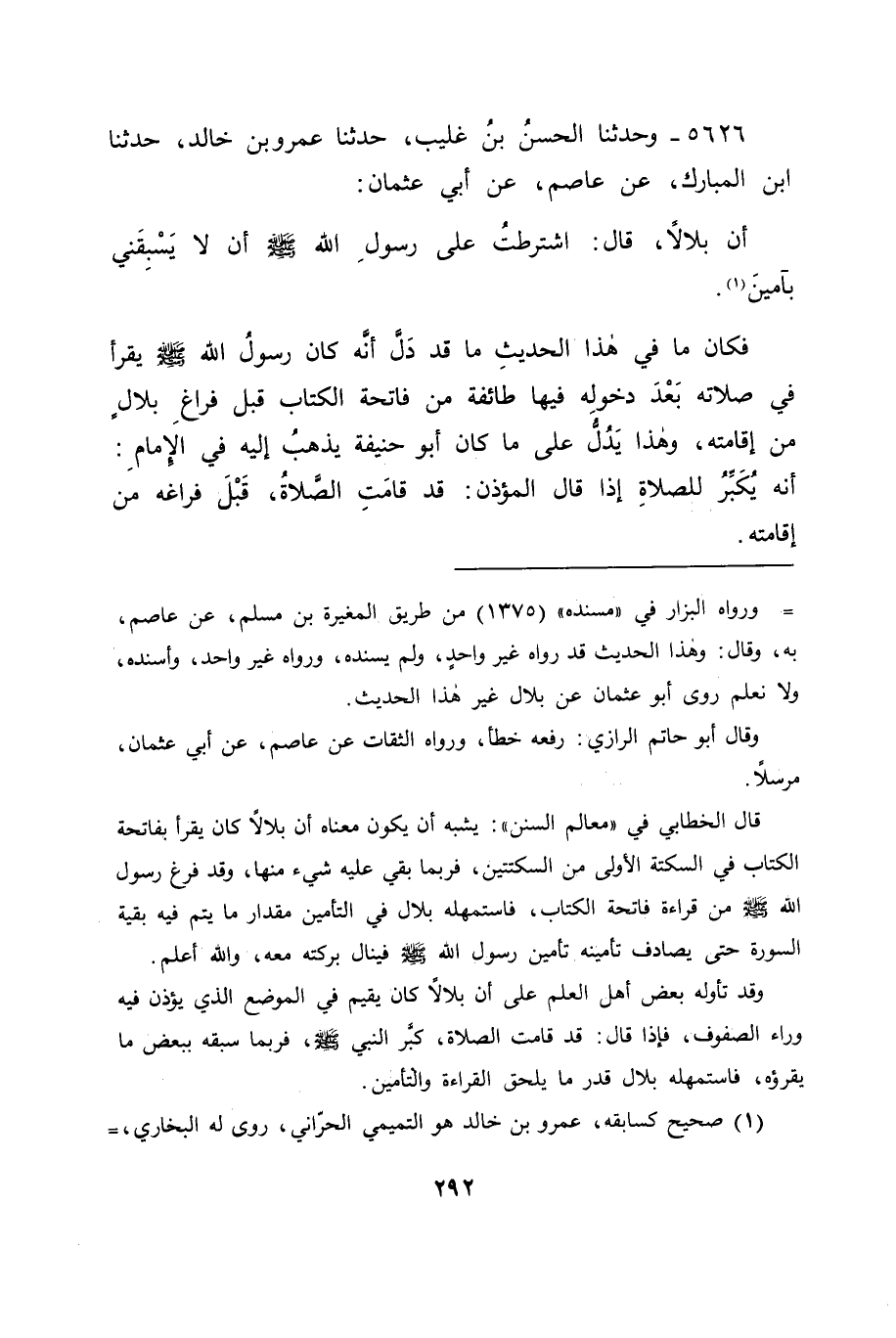 5626 - وَحَدَّثَنَا الْحَسَنُ بْنُ غُلَيْبٍ، حَدَّثَنَا عَمْرُو بْنُ خَالِدٍ، حَدَّثَنَا ابْنُ الْمُبَارَكِ، عَنْ عَاصِمٍ، عَنْ أَبِي عُثْمَانَ، أَنَّ بِلَالًا قَالَ: " اشْتَرَطْتُ عَلَى رَسُولِ اللهِ صَلَّى اللَّهُ عَلَيْهِ وَسَلَّمَ أَنْ لَا يَسْبِقَنِي بِآمِينَ " فَكَانَ مَا فِي هَذَا الْحَدِيثِ مَا قَدْ دَلَّ أَنَّهُ كَانَ رَسُولُ اللهِ صَلَّى اللَّهُ عَلَيْهِ وَسَلَّمَ يَقْرَأُ فِي صَلَاتِهِ بَعْدَ دُخُولِهِ فِيهَا طَائِفَةً مِنْ فَاتِحَةِ الْكِتَابِ قَبْلَ فَرَاغِ بِلَالٍ مِنْ إِقَامَتِهِ، وَهَذَا يَدُلُّ عَلَى مَا كَانَ أَبُو حَنِيفَةَ يَذْهَبُ إِلَيْهِ فِي الْإِمَامِ: أَنَّهُ يُكَبِّرُ لِلصَّلَاةِ إِذَا قَالَ الْمُؤَذِّنُ: قَدْ قَامَتِ الصَّلَاةُ، قَبْلَ فَرَاغِهِ مِنْ إِقَامَتِهِ. -[293]- وَقَدْ رُوِيَ هَذَا الْمَذْهَبُ عَنْ عُمَرَ بْنِ الْخَطَّابِ رَضِيَ اللهُ عَنْهُ