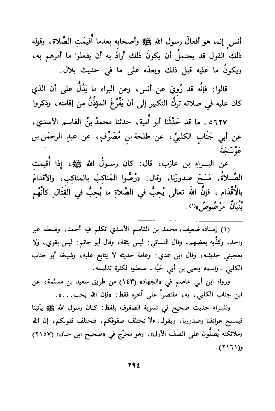 5627 - مَا قَدْ حَدَّثَنَا أَبُو أُمَيَّةَ، حَدَّثَنَا مُحَمَّدُ بْنُ الْقَاسِمِ الْأَسَدِيُّ، عَنْ أَبِي جَنَابٍ الْكَلْبِيِّ، عَنْ طَلْحَةَ بْنِ مُصَرِّفٍ، عَنْ عَبْدِ الرَّحْمَنِ بْنِ عَوْسَجَةَ، عَنِ الْبَرَاءِ بْنِ عَازِبٍ قَالَ: كَانَ رَسُولُ اللهِ صَلَّى اللَّهُ عَلَيْهِ وَسَلَّمَ إِذَا أُقِيمَتِ الصَّلَاةُ مَسَحَ صُدُورَنَا، وَقَالَ: " رُصُّوا الْمَنَاكِبَ بِالْمَنَاكِبِ، وَالْأَقْدَامَ بِالْأَقْدَامِ، فَإِنَّ اللهَ تَعَالَى يُحِبُّ فِي الصَّلَاةِ مَا يُحِبُّ فِي الْقِتَالِ , كَأَنَّهُمْ بُنْيَانٌ مَرْصُوصٌ "
