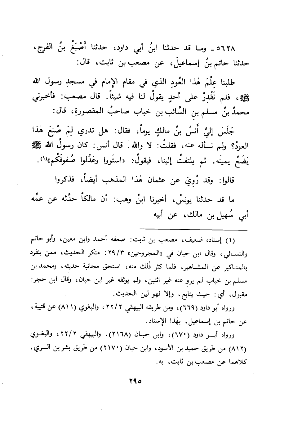 5628 - وَمَا قَدْ حَدَّثَنَا ابْنُ أَبِي دَاوُدَ، حَدَّثَنَا أَصْبَغُ بْنُ الْفَرَجِ، حَدَّثَنَا حَاتِمُ بْنُ إِسْمَاعِيلَ، عَنْ مُصْعَبِ بْنِ ثَابِتٍ قَالَ: طَلَبْنَا عِلْمَ هَذَا الْعُودِ الَّذِي فِي مَقَامِ الْإِمَامِ فِي مَسْجِدِ رَسُولِ اللهِ صَلَّى اللَّهُ عَلَيْهِ وَسَلَّمَ، فَلَمْ نَقْدِرْ عَلَى أَحَدٍ يَقُولُ لَنَا فِيهِ شَيْئًا قَالَ مُصْعَبٌ: فَأَخْبَرَنِي مُحَمَّدُ بْنُ مُسْلِمِ بْنِ السَّائِبِ بْنِ خَبَّابٍ صَاحِبُ الْمَقْصُورَةِ قَالَ: جَلَسَ إِلَيَّ أَنَسُ بْنُ مَالِكٍ يَوْمًا، فَقَالَ: هَلْ تَدْرِي لِمَ صُنِعَ هَذَا الْعُودُ؟ وَلَمْ نَسْأَلْهُ عَنْهُ، فَقُلْتُ: لَا وَاللهِ قَالَ أَنَسٌ: كَانَ رَسُولُ اللهِ صَلَّى اللَّهُ عَلَيْهِ وَسَلَّمَ يَضَعُ يَمِينَهُ، ثُمَّ يَلْتَفِتُ إِلَيْنَا، فَيَقُولُ: " اسْتَوُوا وَعَدِّلُوا صُفُوفَكُمْ " قَالُوا: وَقَدْ رُوِيَ عَنْ عُثْمَانَ هَذَا الْمَذْهَبُ أَيْضًا