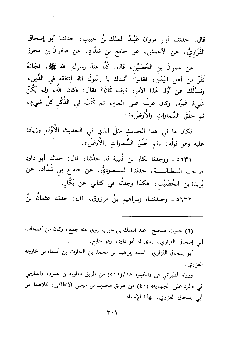 5632 - وَحَدَّثَنَاهُ إِبْرَاهِيمُ بْنُ مَرْزُوقٍ قَالَ: حَدَّثَنَا عُثْمَانُ بْنُ -[302]- عُمَرَ بْنِ فَارِسٍ، حَدَّثَنَا الْمَسْعُودِيُّ، عَنْ جَامِعِ بْنِ شَدَّادٍ، عَنْ صَفْوَانَ بْنِ مُحْرِزٍ، عَنِ ابْنِ حُصَيْبٍ، أَنَّ قَوْمًا، دَخَلُوا عَلَى رَسُولِ اللهِ صَلَّى اللَّهُ عَلَيْهِ وَسَلَّمَ، فَجَعَلَ يُبَشِّرُهُمْ، وَيَقُولُونَ: أَعْطِنَا، فَخَرَجُوا مِنْ عِنْدِهِ، وَدَخَلَ عَلَيْهِ قَوْمٌ آخَرُونَ، فَقَالُوا: أَتَيْنَاكَ نَتَفَقَّهُ فِي الدِّينِ، وَنَسْأَلُ عَنْ بُدُوِّ هَذَا الْأَمْرِ قَالَ: " فَاقْبَلُوا الْبُشْرَى إِذْ لَمْ يَقْبَلْهَا أُولَئِكَ " قَالَ: " كَانَ اللهُ سُبْحَانَهُ لَا شَيْءَ غَيْرُهُ، وَكَانَ عَرْشُهُ عَلَى الْمَاءِ، وَكَتَبَ فِي الذِّكْرِ كُلَّ شَيْءٍ " فَاخْتَلَفَ الْأَعْمَشُ فِي الَّذِي رَجَعَ إِلَيْهِ هَذَا الْحَدِيثُ مِنْ أَصْحَابِ رَسُولِ اللهِ صَلَّى اللَّهُ عَلَيْهِ وَسَلَّمَ، فَذَكَرَ الْأَعْمَشُ: أَنَّهُ عِمْرَانُ بْنُ الْحُصَيْنِ، وَذَكَرَ الْمَسْعُودِيُّ: أَنَّهُ بُرَيْدَةُ بْنُ الْحُصَيْبِ. وَكَانَ الصَّحِيحُ عِنْدَنَا مَا قَالَهُ الْأَعْمَشُ فِيهِ، وَدَلَّ عَلَى ذَلِكَ: أَنَّ الثَّوْرِيَّ قَدْ رَوَاهُ عَنْ جَامِعِ بْنِ شَدَّادٍ , -[303]- فَوَافَقَ الْأَعْمَشَ فِيهِ، وَخَالَفَ الْمَسْعُودِيَّ، وَإِنْ كَانَ قَدْ قَصَّرَ عَنْ بَعْضِ مَتْنِهِ مِمَّا فِي رِوَايَتِهِمَا