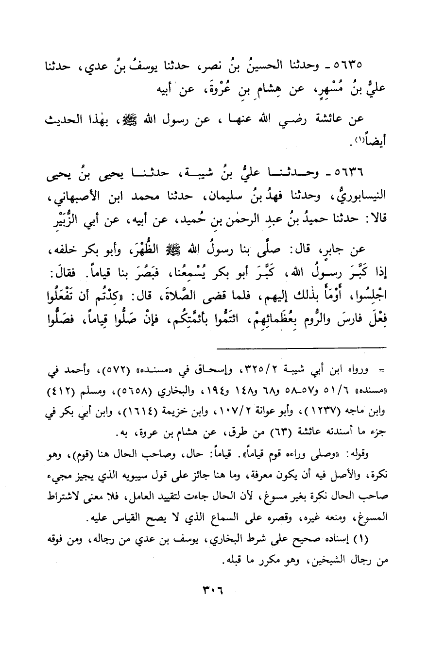 5636 - وَحَدَّثَنَا عَلِيُّ بْنُ شَيْبَةَ، حَدَّثَنَا يَحْيَى بْنُ يَحْيَى النَّيْسَابُورِيُّ، وَحَدَّثَنَا فَهْدُ بْنُ سُلَيْمَانَ، حَدَّثَنَا مُحَمَّدُ بْنُ الْأَصْبَهَانِيِّ قَالَا: حَدَّثَنَا حُمَيْدُ بْنُ عَبْدِ الرَّحْمَنِ بْنِ حُمَيْدٍ، عَنْ أَبِيهِ، عَنْ أَبِي الزُّبَيْرِ، عَنْ جَابِرٍ قَالَ: صَلَّى بِنَا رَسُولُ اللهِ صَلَّى اللَّهُ عَلَيْهِ وَسَلَّمَ الظُّهْرَ، وَأَبُو بَكْرٍ خَلْفَهُ، إِذَا كَبَّرَ رَسُولُ اللهِ، كَبَّرَ أَبُو بَكْرٍ يُسْمِعُنَا، فَبَصُرَ بِنَا قِيَامًا، فَقَالَ: اجْلِسُوا، أَوْمَأَ بِذَلِكَ إِلَيْهِمْ، فَلَمَّا قَضَى الصَّلَاةَ قَالَ: " كِدْتُمْ أَنْ تَفْعَلُوا فِعْلَ فَارِسَ وَالرُّومِ بِعُظَمَائِهِمْ، ائْتَمُّوا بِأَئِمَّتِكُمْ، فَإِنْ صَلَّوْا قِيَامًا، فَصَلُّوا -[307]- قِيَامًا، وَإِنْ صَلَّوْا جُلُوسًا، فَصَلُّوا جُلُوسًا "