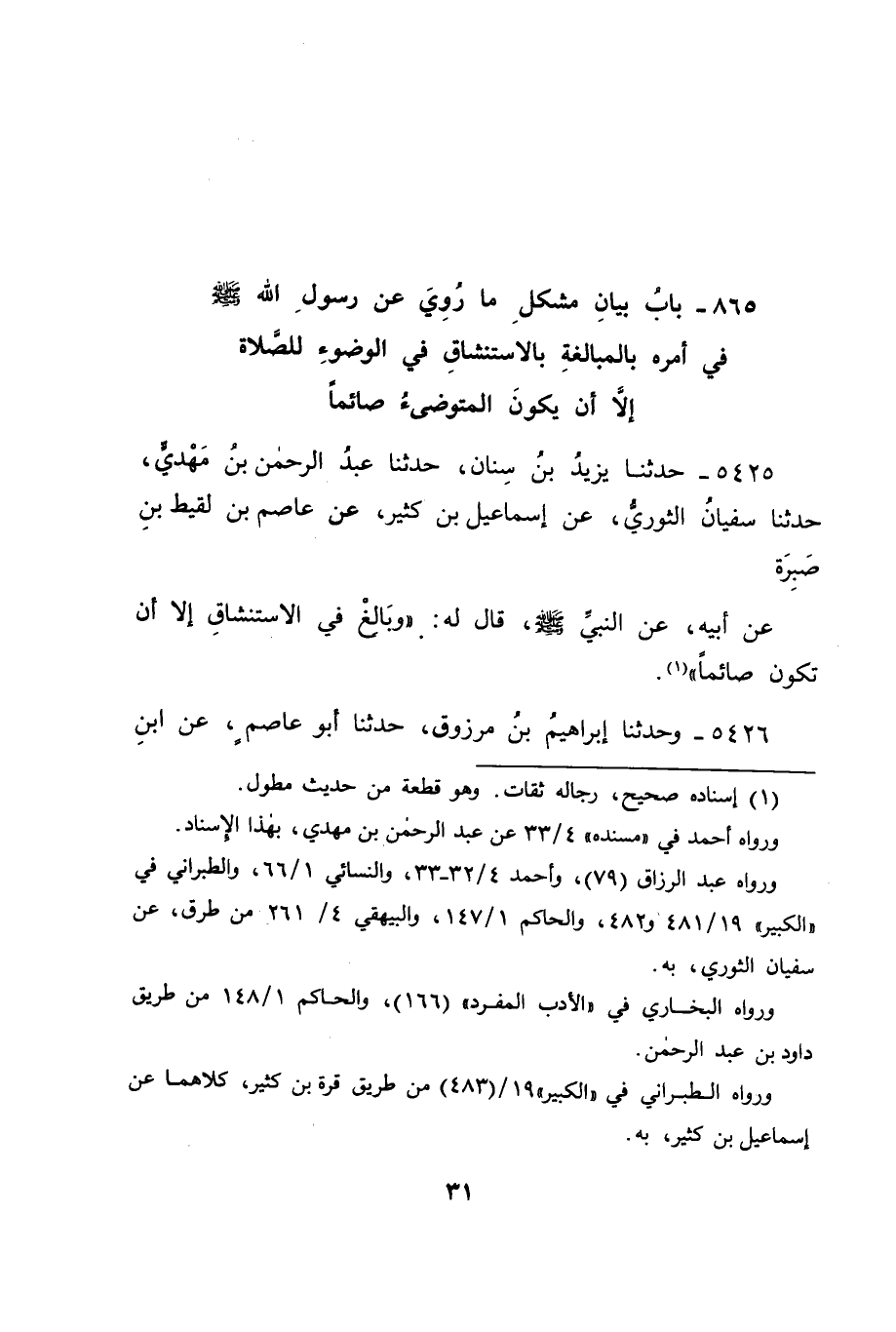 5425 - حَدَّثَنَا يَزِيدُ بْنُ سِنَانٍ، حَدَّثَنَا عَبْدُ الرَّحْمَنِ بْنُ مَهْدِيٍّ، حَدَّثَنَا سُفْيَانُ الثَّوْرِيُّ، عَنْ إِسْمَاعِيلَ بْنِ كَثِيرٍ، عَنْ عَاصِمِ بْنِ لَقِيطِ بْنِ صَبِرَةَ، عَنْ أَبِيهِ، عَنِ النَّبِيِّ صَلَّى اللَّهُ عَلَيْهِ وَسَلَّمَ قَالَ لَهُ: " وَبَالِغْ فِي الِاسْتِنْشَاقِ إِلَّا أَنْ تَكُونَ صَائِمًا "