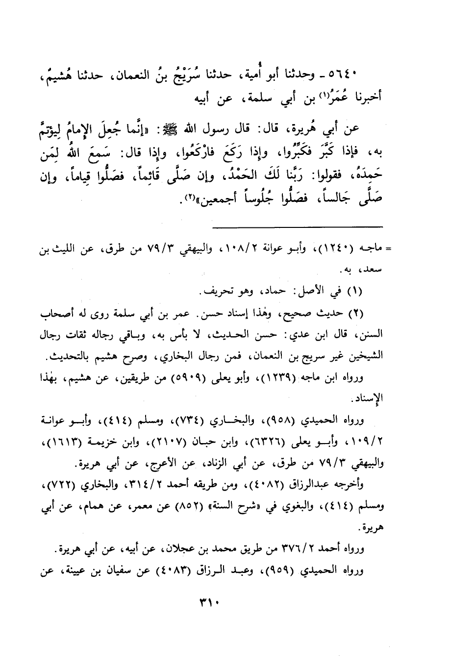 5640 - وَحَدَّثَنَا أَبُو أُمَيَّةَ، حَدَّثَنَا سُرَيْجُ بْنُ النُّعْمَانِ، حَدَّثَنَا هُشَيْمٌ، أَخْبَرَنَا عُمَرُ بْنُ أَبِي سَلَمَةَ، عَنْ أَبِيهِ، عَنْ أَبِي هُرَيْرَةَ قَالَ: قَالَ رَسُولُ اللهِ صَلَّى اللَّهُ عَلَيْهِ وَسَلَّمَ: " إِنَّمَا جُعِلَ الْإِمَامُ لِيُؤْتَمَّ بِهِ، فَإِذَا كَبَّرَ فَكَبِّرُوا، وَإِذَا رَكَعَ فَارْكَعُوا، وَإِذَا قَالَ: سَمِعَ اللهُ لِمَنْ حَمِدَهُ، فَقُولُوا: رَبَّنَا لَكَ الْحَمْدُ، وَإِنْ صَلَّى قَائِمًا، فَصَلُّوا قِيَامًا، وَإِنْ صَلَّى جَالِسًا، فَصَلُّوا جُلُوسًا أَجْمَعِينَ "