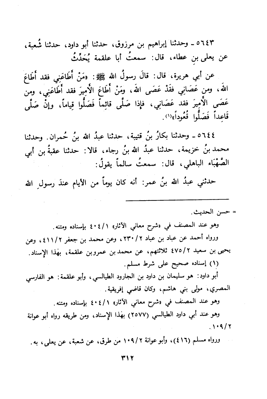 5644 - وَحَدَّثَنَا بَكَّارُ بْنُ قُتَيْبَةَ، حَدَّثَنَا عَبْدُ اللهِ بْنُ حُمْرَانَ، وَحَدَّثَنَا مُحَمَّدُ بْنُ خُزَيْمَةَ، حَدَّثَنَا عَبْدُ اللهِ بْنُ رَجَاءٍ قَالَا: حَدَّثَنَا عُقْبَةُ بْنُ أَبِي الصَّهْبَاءِ الْبَاهِلِيُّ قَالَ: سَمِعْتُ سَالِمًا يَقُولُ: حَدَّثَنِي عَبْدُ اللهِ بْنُ عُمَرَ، أَنَّهُ كَانَ يَوْمًا مِنَ الْأَيَّامِ عِنْدَ رَسُولِ اللهِ صَلَّى اللَّهُ عَلَيْهِ وَسَلَّمَ، -[313]- وَهُوَ فِي نَفَرٍ مِنْ أَصْحَابِهِ، فَقَالَ: " أَلَسْتُمْ تَعْلَمُونَ أَنِّي رَسُولُ اللهِ؟ "، قَالُوا: بَلَى يَا رَسُولَ اللهِ، نَشْهَدُ أَنَّكَ رَسُولُ اللهِ قَالَ: " أَلَسْتُمْ تَعْلَمُونَ أَنَّ اللهَ تَعَالَى أَنْزَلَ فِي كِتَابِهِ: أَنَّ مَنْ أَطَاعَنِي فَقَدْ أَطَاعَ اللهَ؟ "، قَالُوا: بَلَى نَشْهَدُ أَنَّ مَنْ أَطَاعَكَ فَقَدْ أَطَاعَ اللهَ قَالَ: " فَإِنَّ مِنْ طَاعَتِي أَنْ تُطِيعُوا أَئِمَّتَكُمْ، فَإِنْ صَلَّوْا قُعُودًا، فَصَلُّوا قُعُودًا " فَقَالَ قَائِلٌ: فَهَذِهِ الْآثَارُ قَدْ جَاءَتْ عَنْ رَسُولِ اللهِ صَلَّى اللَّهُ عَلَيْهِ وَسَلَّمَ مَجِيئًا مُتَوَاتِرًا مِنْ وُجُوهٍ صِحَاحٍ مَقْبُولَةٍ، ثُمَّ قَدْ عَمِلَ بِهِ بَعْدَهُ غَيْرُ وَاحِدٍ مِنْ أَصْحَابِ رَسُولِ اللهِ صَلَّى اللَّهُ عَلَيْهِ وَسَلَّمَ، مِنْهُمْ: أُسَيْدُ بْنُ حُضَيْرٍ