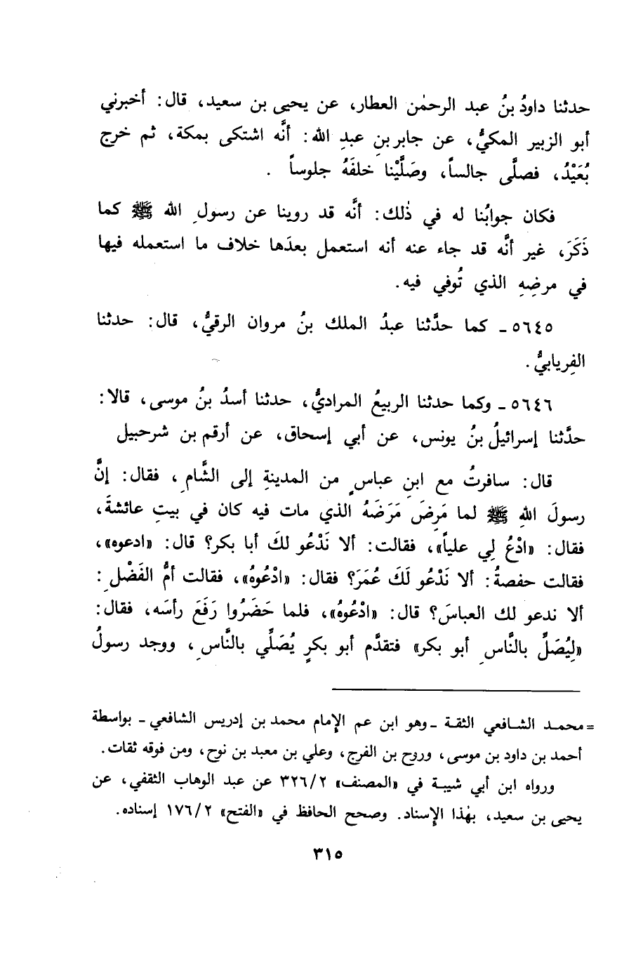 5646 - وَكَمَا حَدَّثَنَا الرَّبِيعُ الْمُرَادِيُّ، حَدَّثَنَا أَسَدُ بْنُ مُوسَى قَالَا: حَدَّثَنَا إِسْرَائِيلُ بْنُ يُونُسَ، عَنْ أَبِي إِسْحَاقَ، عَنْ أَرْقَمَ بْنِ شُرَحْبِيلَ قَالَ: سَافَرْتُ مَعَ ابْنِ عَبَّاسٍ مِنَ الْمَدِينَةِ إِلَى الشَّامِ، فَقَالَ: إِنَّ رَسُولَ اللهِ صَلَّى اللَّهُ عَلَيْهِ وَسَلَّمَ لَمَّا مَرِضَ مَرَضَهُ الَّذِي مَاتَ فِيهِ كَانَ فِي بَيْتِ عَائِشَةَ، فَقَالَ: " ادْعُ لِي عَلِيًّا "، فَقَالَتْ: أَلَا نَدْعُو لَكَ أَبَا بَكْرٍ؟ قَالَ: " ادْعُوهُ "، فَقَالَتْ حَفْصَةُ: أَلَا نَدْعُو لَكَ عُمَرَ؟، فَقَالَ: " ادْعُوهُ "، فَقَالَتْ أُمُّ الْفَضْلِ: أَلَا نَدْعُو لَكَ الْعَبَّاسَ؟ قَالَ: " ادْعُوهُ "، فَلَمَّا حَضَرُوا رَفَعَ رَأْسَهُ، فَقَالَ: " لِيُصَلِّ بِالنَّاسِ أَبُو بَكْرٍ "، فَتَقَدَّمَ أَبُو بَكْرٍ يُصَلِّي بِالنَّاسِ، وَوَجَدَ رَسُولُ -[316]- اللهِ صَلَّى اللَّهُ عَلَيْهِ وَسَلَّمَ خِفَّةً، فَخَرَجَ يُهَادَى بَيْنَ رَجُلَيْنِ، فَلَمَّا أَحَسَّ بِهِ أَبُو بَكْرٍ سَبَّحُوا، فَذَهَبَ أَبُو بَكْرٍ يَتَأَخَّرُ، فَأَشَارَ إِلَيْهِ النَّبِيُّ عَلَيْهِ السَّلَامُ: مَكَانَكَ، فَاسْتَمَرَّ رَسُولُ اللهِ صَلَّى اللَّهُ عَلَيْهِ وَسَلَّمَ مِنْ حَيْثُ انْتَهَى أَبُو بَكْرٍ مِنَ الْقُرْآنِ، وَأَبُو بَكْرٍ قَائِمٌ، وَالنَّبِيُّ صَلَّى اللَّهُ عَلَيْهِ وَسَلَّمَ جَالِسٌ، فَائْتَمَّ أَبُو بَكْرٍ بِرَسُولِ اللهِ صَلَّى اللَّهُ عَلَيْهِ وَسَلَّمَ، فَلَمَّا قَضَى رَسُولُ اللهِ صَلَّى اللَّهُ عَلَيْهِ وَسَلَّمَ الصَّلَاةَ حَتَّى ثَقُلَ، فَخَرَجَ يُهَادَى بَيْنَ رَجُلَيْنِ، وَإِنَّ رِجْلَيْهِ لَتَخُطَّانِ بِالْأَرْضِ، فَمَاتَ رَسُولُ اللهِ صَلَّى الله عَلَيْهِ وَسَلمَ بَعْدَ يَوْمٍ فَكَانَ فِي هَذَا الْحَدِيثِ: أَنَّ رَسُولَ اللهِ صَلَّى اللَّهُ عَلَيْهِ وَسَلَّمَ كَانَ يُصَلِّي بِالنَّاسِ جَالِسًا، وَأَبُو بَكْرٍ قَائِمٌ، وَالنَّاسُ أَيْضًا كَذَلِكَ