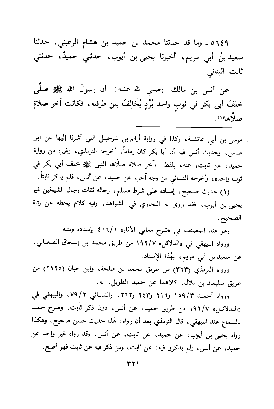 5649 - وَمَا قَدْ حَدَّثَنَا مُحَمَّدُ بْنُ حُمَيْدِ بْنِ هِشَامٍ الرُّعَيْنِيُّ، حَدَّثَنَا سَعِيدُ بْنُ أَبِي مَرْيَمَ، أَخْبَرَنَا يَحْيَى بْنُ أَيُّوبَ، حَدَّثَنِي حُمَيْدٌ، حَدَّثَنِي ثَابِتٌ الْبُنَانِيُّ، عَنْ أَنَسِ بْنِ مَالِكٍ رَضِيَ اللهُ عَنْهُ، " أَنَّ رَسُولَ اللهِ صَلَّى اللَّهُ عَلَيْهِ وَسَلَّمَ صَلَّى خَلْفَ أَبِي بَكْرٍ فِي ثَوْبٍ وَاحِدٍ بُرْدٍ يُخَالِفُ بَيْنَ طَرَفَيْهِ، فَكَانَتْ آخِرَ صَلَاةٍ صَلَّاهَا " -[322]- قَالَ: فَكَانَ فِي حَدِيثِ عَائِشَةَ، وَأَنَسٍ هَذَيْنِ أَنَّ رَسُولَ اللهِ صَلَّى اللَّهُ عَلَيْهِ وَسَلَّمَ كَانَ فِي تِلْكَ الصَّلَاةِ مَأْمُومًا لَا إِمَامًا. فَكَانَ جَوَابَنَا لَهُ فِي ذَلِكَ أَنَّ الْأَوْلَى بِنَا فِي الْآثَارِ إِذَا وَقَعَ مِثْلُ مَا وَقَعَ فِي هَذَا أَنْ نَحْمِلَهَا عَلَى الِاتِّفَاقِ، وَأَنْ نَصْرِفَ وُجُوهَهَا إِلَى مَا احْتَمَلَتْ صَرْفَهَا إِلَيْهِ، وَأَنْ لَا نَحْمِلَهَا عَلَى التَّضَادِّ وَالتَّبَايُنِ مَا وَجَدْنَا السَّبِيلَ إِلَى ذَلِكَ، وَكَانَ فِي حَدِيثِ عُبَيْدِ اللهِ بْنِ عَبْدِ اللهِ، عَنِ ابْنِ عَبَّاسٍ، وَعَنْ عَائِشَةَ، أَنَّ أَبَا بَكْرٍ قَدْ كَانَ يُصَلِّي بِالنَّاسِ تِلْكَ الْأَيَّامَ الَّتِي كَانَ رَسُولُ اللهِ صَلَّى اللَّهُ عَلَيْهِ وَسَلَّمَ كَانَ فِيهَا مُتَخَلِّفًا عَنِ الصَّلَاةِ لِمَرَضِهِ الْقَاطِعِ لَهُ عَنْ ذَلِكَ، فَاحْتُمِلَ أَنْ يَكُونَ مَا كَانَ مِنْهُ فِي حَدِيثَيِ ابْنِ عَبَّاسٍ، وَالْأَسْوَدِ، وَعُبَيْدِ اللهِ، عَنْ عَائِشَةَ عَلَى صَلَاةٍ كَانَ مِنْهُ مَا كَانَ مِنْهُ فِيهَا وَهُوَ الْإِمَامُ، وَأَبُو بَكْرٍ مَأْمُومٌ. وَكَانَ الَّذِي فِي حَدِيثَيْ أَنَسٍ وَمَسْرُوقٍ، عَنْ عَائِشَةَ فِي صَلَاةٍ أُخْرَى مِنْ تِلْكَ الصَّلَاةِ الَّتِي صَلَّى بِهَا رَسُولُ اللهِ صَلَّى اللَّهُ عَلَيْهِ وَسَلَّمَ خَلْفَ أَبِي بَكْرٍ رَضِيَ اللهُ عَنْهُ، وَلَمَّا تَوَجَّهَ هَذَا الْمَعْنَى فِي هَذِهِ الْآثَارِ، عَقَلْنَا بِذَلِكَ، أَنَّ رَسُولَ اللهِ صَلَّى اللَّهُ عَلَيْهِ وَسَلَّمَ قَدْ كَانَ صَلَّى لِلنَّاسِ جَالِسًا، وَكَانُوا خَلْفَهُ قِيَامًا، وَحَقَّقَ ذَلِكَ مَا فِي حَدِيثِ الْأَرْقَمِ، عَنِ ابْنِ عَبَّاسٍ، مِنْ أَخْذِهِ صَلَّى اللَّهُ عَلَيْهِ وَسَلَّمَ مِنْ حَدِيثٍ كَانَ انْتَهَى إِلَيْهِ أَبُو بَكْرٍ رَضِيَ اللهُ عَنْهُ، وَلَا يَجُوزُ ذَلِكَ إِلَّا وَهُوَ الْإِمَامُ فِي تِلْكَ الصَّلَاةِ، وَذَلِكَ عَلَيْهِ بِمَا كَانَ أَبُو بَكْرٍ انْتَهَى إِلَيْهِ مِنَ الْقِرَاءَةِ فِيهَا، فَثَبَتَ بِذَلِكَ أَنَّهُ كَانَ فِيهَا إِمَامًا لَا مَأْمُومًا؛ لِأَنَّ الْمَأْمُومَ لَا يَقْرَأُ خَلْفَ الْإِمَامِ -[323]- فِيمَا يُجْهَرُ فِيهِ بِالْقِرَاءَةِ، إِلَّا أَنَّهُ قَالَتْ طَائِفَةٌ: يَقْرَأُ بِأُمِّ الْقُرْآنِ خَاصَّةً، وَفِي حَدِيثِ الْأَسْوَدِ، عَنْ عَائِشَةَ أَنَّ جُلُوسَهُ كَانَ عَنْ يَسَارِ أَبِي بَكْرٍ، وَكَانَ ذَلِكَ جُلُوسَ الْإِمَامِ لَا جُلُوسَ الْمَأْمُومِ؛ لِأَنَّ أَبَا بَكْرٍ رَضِيَ اللهُ عَنْهُ عَادَ بِهِ إِلَى يَمِينِهِ، وَذَلِكَ مَقَامُ الْمَأْمُومِ لَا مَقَامُ الْإِمَامِ، وَكَانَ مَعْقُولًا بِجُلُوسِهِ عَنْ يَسَارِ أَبِي بَكْرٍ لَا خَلْفَهُ، عَلَى أَنَّهُ أَرَادَ بِذَلِكَ الْإِمَامَةَ فِي تِلْكَ الصَّلَاةِ لَا الِائْتِمَامَ فِيهَا، وَلَوْ أَرَادَ الِائْتِمَامَ بِغَيْرِهِ لَجَلَسَ خَلْفَهُ كَمَا فَعَلَ فِي يَوْمَ بَنِي عَمْرِو بْنِ عَوْفٍ، لَمَّا ذَهَبَ لِيُصْلِحَ بَيْنَهُمْ، فَجَاءَ أَبُو بَكْرٍ يُصَلِّي بِالنَّاسِ