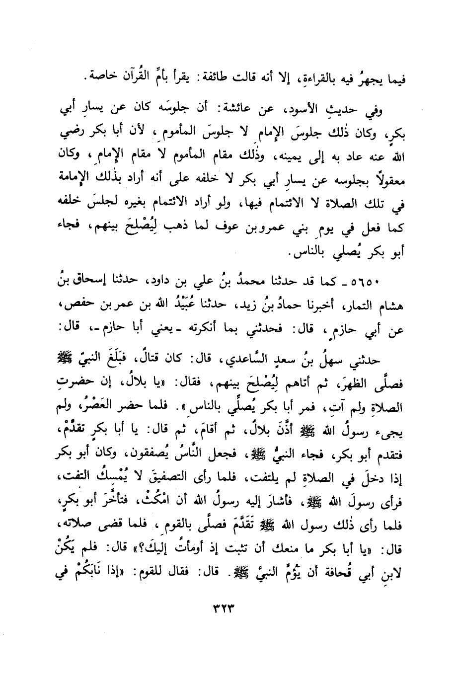 5650 - كَمَا قَدْ حَدَّثَنَا مُحَمَّدُ بْنُ عَلِيِّ بْنِ دَاوُدَ، حَدَّثَنَا إِسْحَاقُ بْنُ هِشَامٍ التَّمَّارُ، أَخْبَرَنَا حَمَّادُ بْنُ زَيْدٍ، حَدَّثَنَا عُبَيْدُ اللهِ بْنُ عُمَرَ بْنِ حَفْصٍ، عَنْ أَبِي حَازِمٍ قَالَ: فَحَدَّثَنِي بِمَا أَنْكَرْتُهُ - يَعْنِي أَبَا حَازِمٍ - قَالَ: حَدَّثَنِي سَهْلُ بْنُ سَعْدٍ السَّاعِدِيُّ قَالَ: كَانَ قِتَالٌ، فَبَلَغَ النَّبِيَّ صَلَّى اللَّهُ عَلَيْهِ وَسَلَّمَ، فَصَلَّى الظُّهْرَ، ثُمَّ أَتَاهُمْ لِيُصْلِحَ بَيْنَهُمْ، فَقَالَ: " يَا بِلَالُ، إِنْ حَضَرَتِ الصَّلَاةُ وَلَمْ آتِ، فَمُرْ أَبَا بَكْرٍ يُصَلِّي بِالنَّاسِ "، فَلَمَّا حَضَرَ الْعَصْرُ، وَلَمْ يَجِئْ رَسُولُ اللهِ صَلَّى اللَّهُ عَلَيْهِ وَسَلَّمَ أَذَّنَ بِلَالٌ، ثُمَّ أَقَامَ، ثُمَّ قَالَ: يَا أَبَا بَكْرٍ تَقَدَّمْ، فَتَقَدَّمَ أَبُو بَكْرٍ، فَجَاءَ النَّبِيُّ صَلَّى اللَّهُ عَلَيْهِ وَسَلَّمَ، فَجَعَلَ النَّاسُ يُصَفِّقُونَ، وَكَانَ أَبُو بَكْرٍ إِذَا دَخَلَ فِي الصَّلَاةِ لَمْ يَلْتَفِتْ، فَلَمَّا رَأَى التَّصْفِيقَ لَا يُمْسِكُ الْتَفَتَ، فَرَأَى رَسُولَ اللهِ صَلَّى اللَّهُ عَلَيْهِ وَسَلَّمَ، فَأَشَارَ إِلَيْهِ رَسُولُ اللهِ أَنِ امْكُثْ، فَتَأَخَّرَ أَبُو بَكْرٍ، فَلَمَّا رَأَى ذَلِكَ رَسُولُ اللهِ صَلَّى اللَّهُ عَلَيْهِ وَسَلَّمَ تَقَدَّمَ , فَصَلَّى بِالْقَوْمِ، فَلَمَّا قَضَى صَلَاتَهُ قَالَ: " يَا أَبَا بَكْرٍ مَا مَنَعَكَ أَنْ تَثْبُتَ إِذْ أَوْمَأْتُ إِلَيْكَ؟ " قَالَ: فَلَمْ يَكُنْ لِابْنِ أَبِي قُحَافَةَ أَنْ يَؤُمَّ النَّبِيَّ صَلَّى اللَّهُ عَلَيْهِ وَسَلَّمَ قَالَ: فَقَالَ لِلْقَوْمِ: " إِذَا نَابَكُمْ فِي -[324]- صَلَاتِكُمْ شَيْءٌ، فَالتَّسْبِيحُ لِلرِّجَالِ، وَالتَّصْفِيقُ لِلنِّسَاءِ "