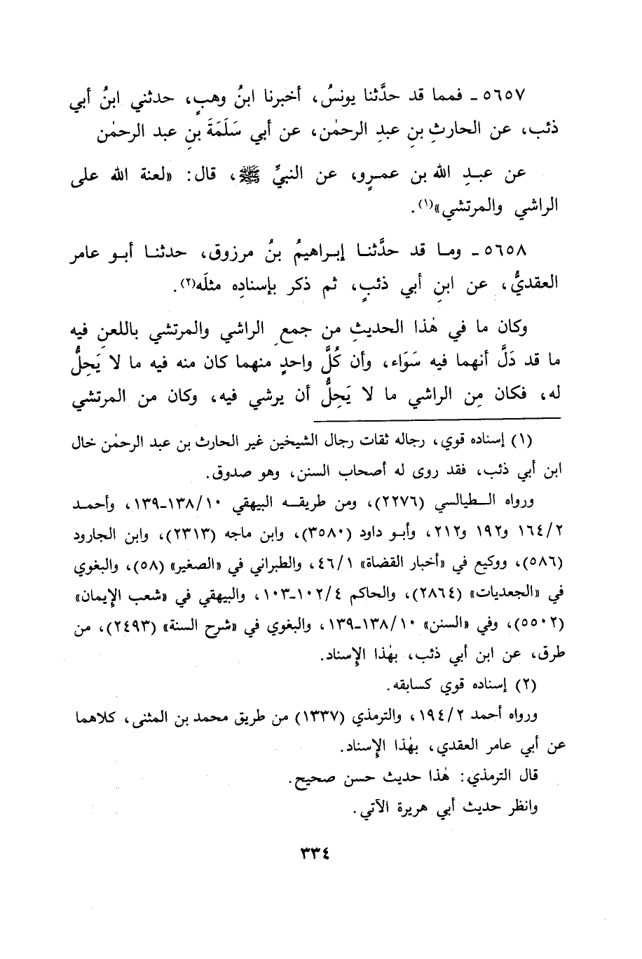5657 - فَمِمَّا قَدْ حَدَّثَنَا يُونُسُ، أَخْبَرَنَا ابْنُ وَهْبٍ، حَدَّثَنِي ابْنُ أَبِي ذِئْبٍ، عَنِ الْحَارِثِ بْنِ عَبْدِ الرَّحْمَنِ، عَنْ أَبِي سَلَمَةَ بْنِ عَبْدِ الرَّحْمَنِ، عَنْ عَبْدِ اللهِ بْنِ عَمْرٍو، عَنِ النَّبِيِّ صَلَّى اللَّهُ عَلَيْهِ وَسَلَّمَ قَالَ: " لَعْنَةُ اللهِ عَلَى الرَّاشِي وَالْمُرْتَشِي " ,