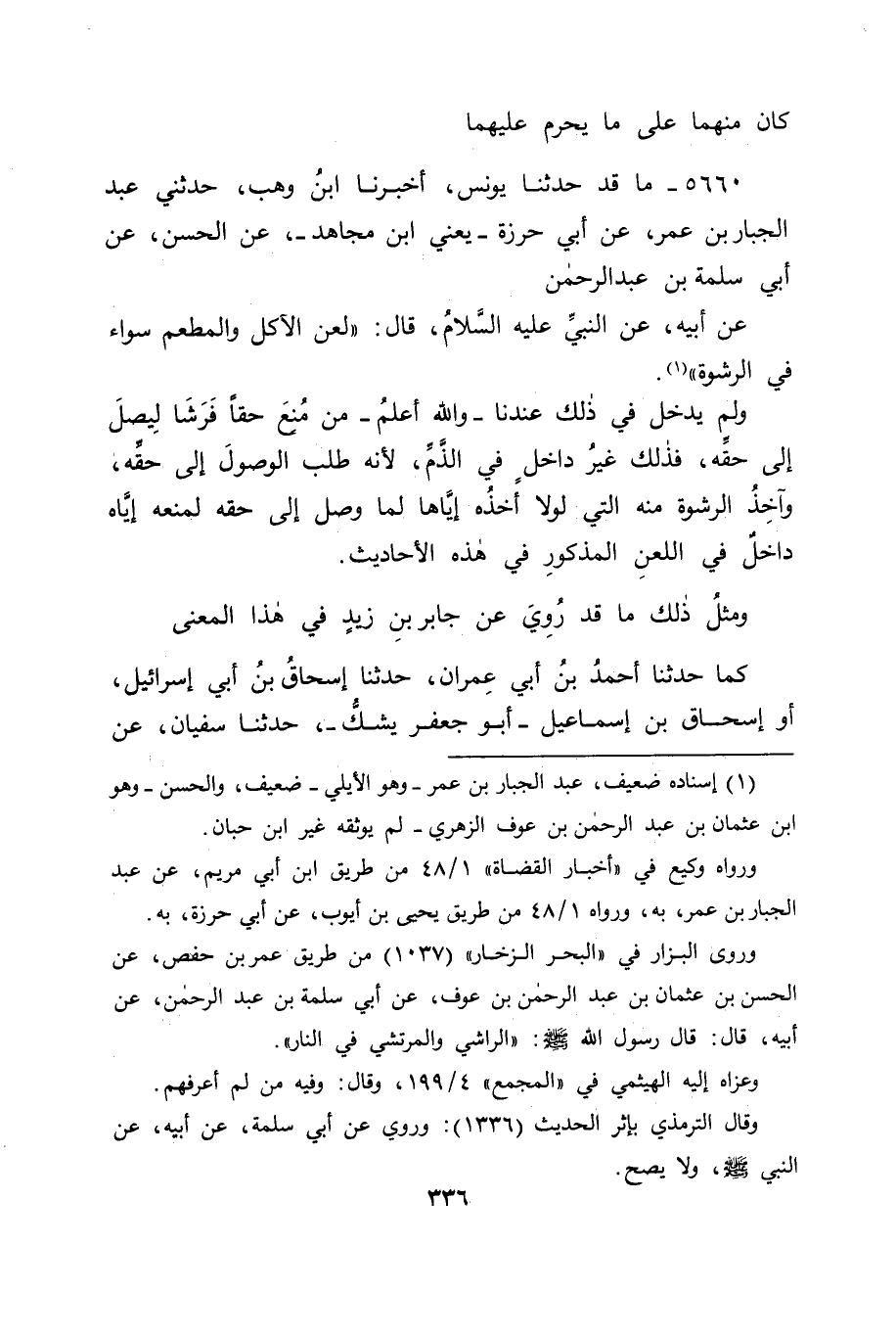 5660 - مَا قَدْ حَدَّثَنَا يُونُسُ، أَخْبَرَنَا ابْنُ وَهْبٍ، حَدَّثَنِي عَبْدُ الْجَبَّارِ بْنُ عُمَرَ، عَنْ أَبِي حِرْزَةَ يَعْنِي ابْنَ مُجَاهِدٍ عَنِ الْحَسَنِ، عَنْ أَبِي سَلَمَةَ بْنِ عَبْدِ الرَّحْمَنِ، عَنْ أَبِيهِ، عَنِ النَّبِيِّ عَلَيْهِ السَّلَامُ قَالَ: " لَعْنُ الْآكِلِ، وَالْمُطْعِمِ، سَوَاءٌ فِي الرِّشْوَةِ " وَلَمْ يَدْخُلْ فِي ذَلِكَ عِنْدَنَا - وَاللهُ أَعْلَمُ - مَنْ مُنِعَ حَقًّا فَرَشَا لِيَصِلَ إِلَى حَقِّهِ، فَذَلِكَ غَيْرُ دَاخِلٍ فِي الذَّمِّ؛ لِأَنَّهُ طَلَبَ الْوُصَولَ إِلَى حَقِّهِ، وَآخُذُ الرِّشْوَةِ مِنْهُ الَّتِي لَوْلَا أَخْذُهُ إِيَّاهَا لَمَا وَصَلَ إِلَى حَقِّهِ لِمَنْعِهِ إِيَّاهُ دَاخِلٌ فِي اللَّعْنِ الْمَذْكُورِ فِي هَذِهِ الْأَحَادِيثِ , وَمِثْلُ ذَلِكَ مَا قَدُ رُوِيَ عَنْ جَابِرِ بْنِ زَيْدٍ فِي هَذَا الْمَعْنَى