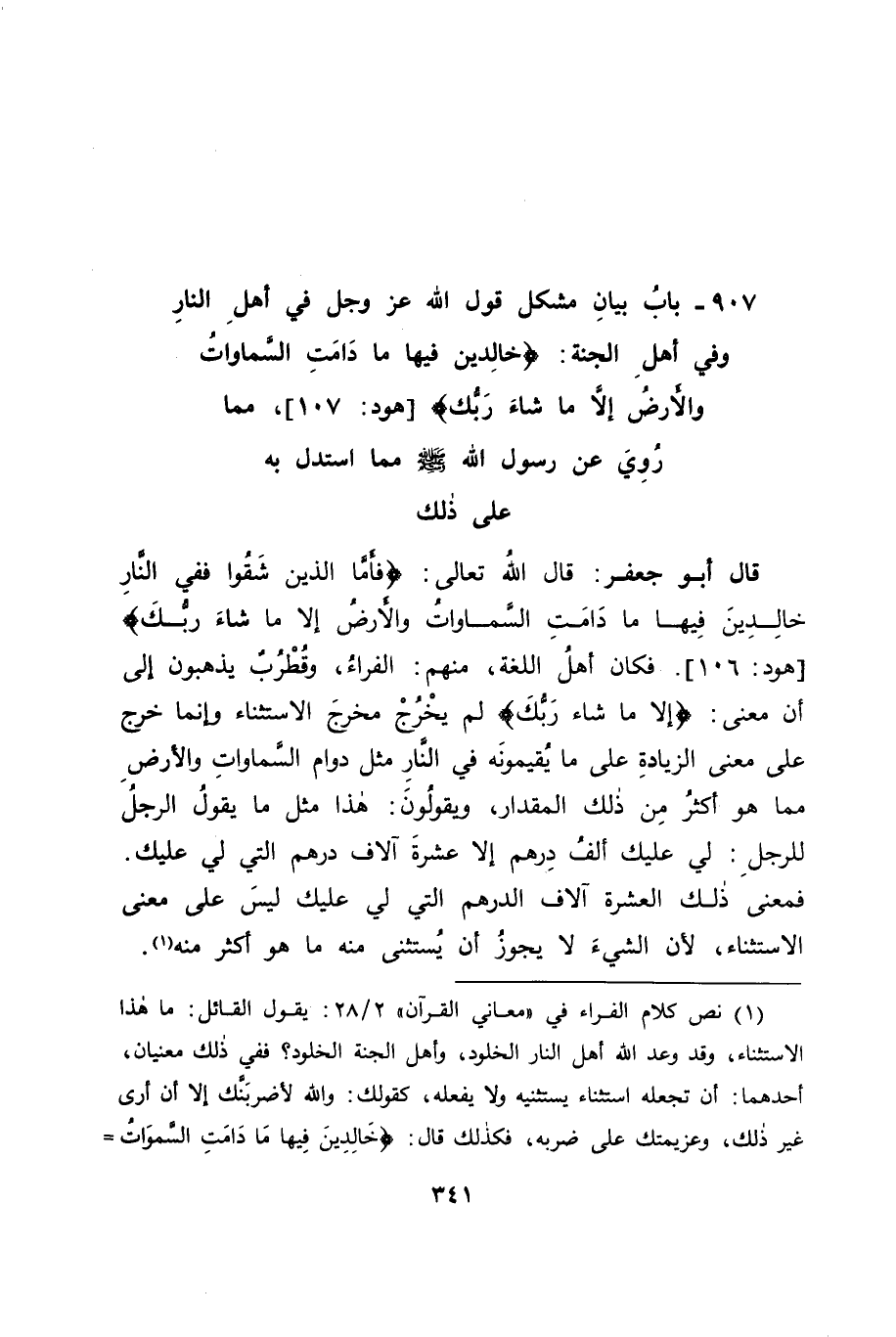 بَابُ بَيَانِ مُشْكِلِ قَوْلِ اللهِ عَزَّ وَجَلَّ فِي أَهْلِ النَّارِ، وَفِي أَهْلِ الْجَنَّةِ: {خَالِدِينَ فِيهَا مَا دَامَتِ السَّمَوَاتُ وَالْأَرْضُ إِلَّا مَا شَاءَ رَبُّكَ} ، مِمَّا رُوِيَ عَنْ رَسُولِ اللهِ صَلَّى اللَّهُ عَلَيْهِ وَسَلَّمَ مِمَّا اسْتُدِلَّ بِهِ عَلَى ذَلِكَ قَالَ أَبُو جَعْفَرٍ: قَالَ اللهُ تَعَالَى: {فَأَمَّا الَّذِينَ شَقُوا فَفِي النَّارِ خَالِدِينَ فِيهَا مَا دَامَتِ السَّمَوَاتُ وَالْأَرْضُ إِلَّا مَا شَاءَ رَبُّكَ} ، فَكَانَ أَهْلُ اللُّغَةِ، مِنْهُمُ: الْفَرَّاءُ، وَقُطْرُبٌ يَذْهَبُونَ إِلَى أَنَّ مَعْنَى: {إِلَّا مَا شَاءَ رَبُّكَ} [هود: 107] لَمْ يَخْرُجْ مَخْرَجَ الِاسْتِثْنَاءِ، وَإِنَّمَا خَرَجَ عَلَى مَعْنَى الزِّيَادَةِ عَلَى مَا يُقِيمُونَهُ فِي النَّارِ مِثْلَ دَوَامِ السَّمَاوَاتِ وَالْأَرْضِ، مِمَّا هُوَ أَكْثَرُ مِنْ ذَلِكَ الْمِقْدَارِ، وَيَقُولُونَ: هَذَا مِثْلُ مَا يَقُولُ الرَّجُلُ لِلرَّجُلِ: لِي عَلَيْكَ أَلْفُ دِرْهَمٍ إِلَّا عَشْرَةَ آلَافِ دِرْهَمٍ الَّتِي لِي عَلَيْكَ، فَمَعْنَى ذَلِكَ الْعَشَرَةُ آلَافِ الدِّرْهَمِ الَّتِي لِي عَلَيْكَ لَيْسَ عَلَى مَعْنَى الِاسْتِثْنَاءِ؛ لِأَنَّ الشَّيْءَ لَا يَجُوزُ أَنْ يُسْتَثْنَى مِنْهُ مَا هُوَ أَكْثَرُ مِنْهُ.