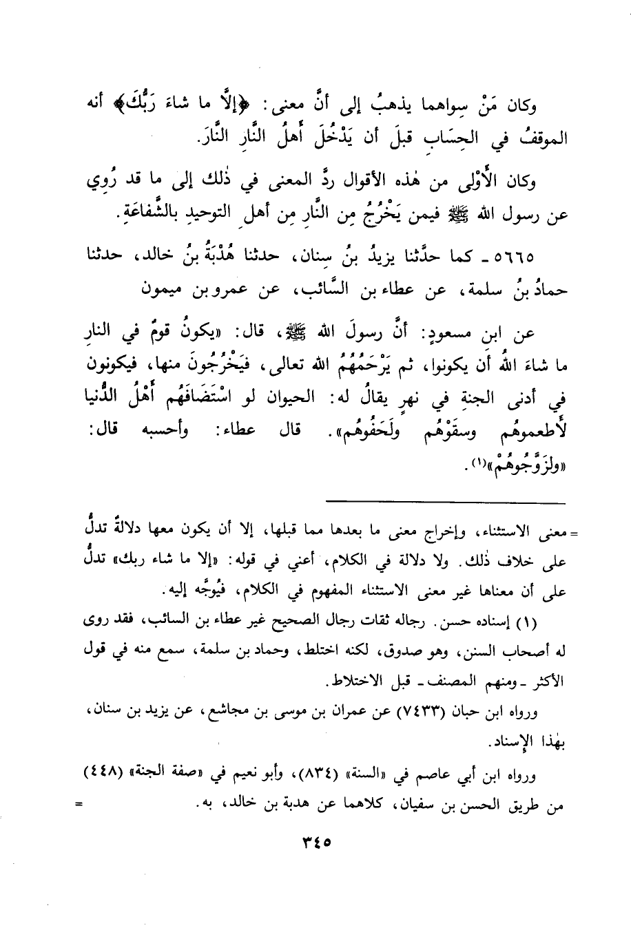 5665 - كَمَا حَدَّثَنَا يَزِيدُ بْنُ سِنَانٍ، حَدَّثَنَا هُدْبَةُ بْنُ خَالِدٍ، حَدَّثَنَا حَمَّادُ بْنُ سَلَمَةَ، عَنْ عَطَاءِ بْنِ السَّائِبِ، عَنْ عَمْرِو بْنِ مَيْمُونٍ، عَنِ ابْنِ مَسْعُودٍ، أَنَّ رَسُولَ اللهِ صَلَّى اللَّهُ عَلَيْهِ وَسَلَّمَ قَالَ: " يَكُونُ قَوْمٌ فِي النَّارِ مَا شَاءَ اللهُ أَنْ يَكُونُوا، ثُمَّ يَرْحَمُهُمُ اللهُ تَعَالَى، فَيَخْرُجُونَ مِنْهَا، فَيَكُونُونَ فِي أَدْنَى الْجَنَّةِ فِي نَهَرٍ يُقَالُ لَهُ: الْحَيَوَانُ , لَوِ اسْتَضَافَهُمْ أَهْلُ الدُّنْيَا لَأَطْعَمُوهُمْ، وَسَقَوْهُمْ، وَلَحَفَوْهُمْ " قَالَ عَطَاءٌ: وَأَحْسِبُهُ قَالَ: " وَلَزَوَّجُوهُمْ " -[346]- وَقَدْ ذَكَرْنَا فِيمَا تَقَدَّمَ مِنَّا فِي كِتَابِنَا هَذَا فِي بَابِ بَيَانِ مُشْكِلِ مَا رُوِيَ عَنْ رَسُولِ اللهِ صَلَّى اللَّهُ عَلَيْهِ وَسَلَّمَ مِنْ قَوْلِهِ: " مَوْضِعُ سَوْطٍ فِي الْجَنَّةِ خَيْرٌ مِنَ الدُّنْيَا وَمَا فِيهَا "، فِي هَذَا الْبَابِ، عَنِ ابْنِ مَسْعُودٍ، عَنْ رَسُولِ اللهِ صَلَّى اللَّهُ عَلَيْهِ وَسَلَّمَ، مَا نَحْنُ مُسْتَغْنُونَ عَنْ إِعَادَتِهِ