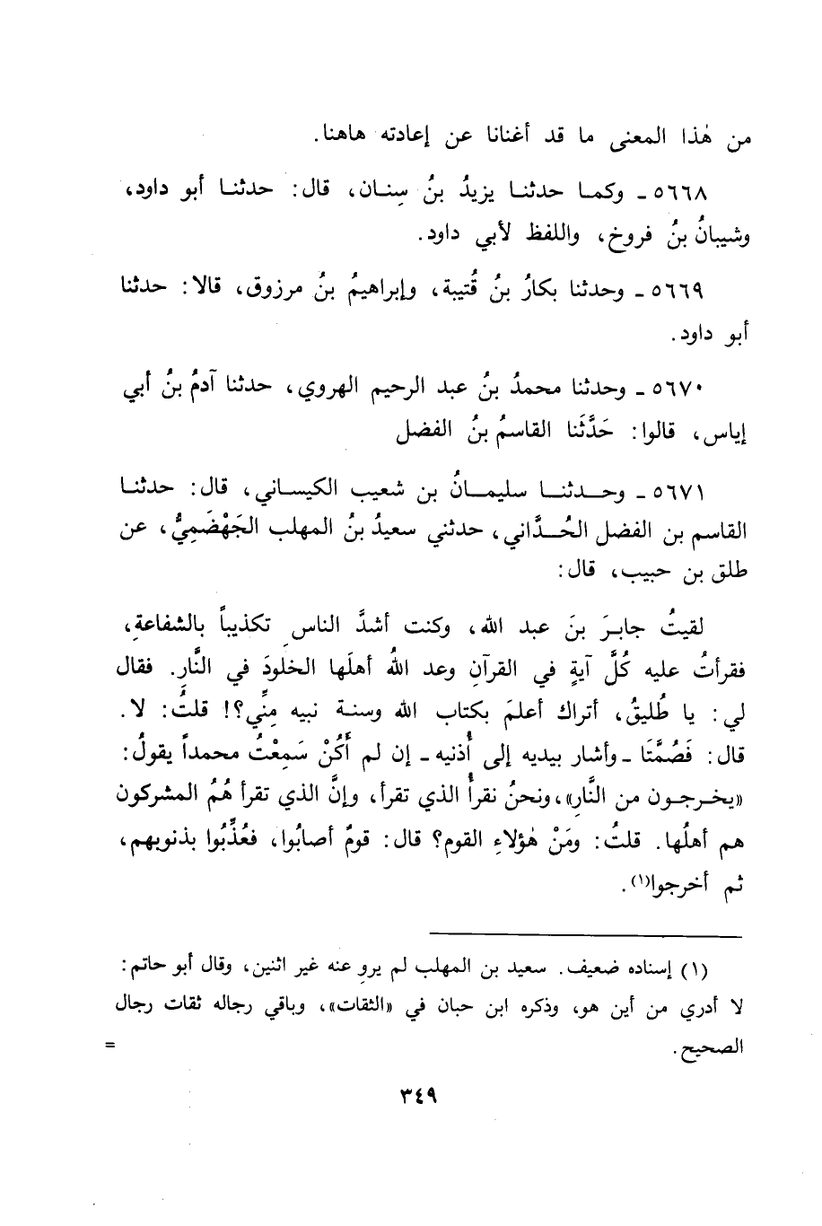 5671 - وَحَدَّثَنَا سُلَيْمَانُ بْنُ شُعَيْبٍ الْكَيْسَانِيُّ قَالَ: حَدَّثَنَا الْقَاسِمُ بْنُ الْفَضْلِ الْحُدَّانِيُّ، حَدَّثَنِي سَعِيدُ بْنُ الْمُهَلَّبِ الْجَهْضَمِيُّ، عَنْ طَلْقِ بْنِ حَبِيبٍ قَالَ: لَقِيتُ جَابِرَ بْنَ عَبْدِ اللهِ، وَكُنْتُ أَشَدَّ النَّاسِ تَكْذِيبًا بِالشَّفَاعَةِ، فَقَرَأْتُ عَلَيْهِ كُلَّ آيَةٍ فِي الْقُرْآنِ وَعَدَ اللهُ أَهْلَهَا الْخُلُودَ فِي النَّارِ، فَقَالَ لِي: يَا طُلَيْقُ، أَتُرَاكَ أَعْلَمَ بِكِتَابِ اللهِ وَسُنَّةِ نَبِيِّهِ مِنِّي؟ قُلْتُ: لَا قَالَ: فَصُمَّتَا - وَأَشَارَ بِيَدَيْهِ إِلَى أُذُنَيْهِ - إِنْ لَمْ أَكُنْ سَمِعْتُ مُحَمَّدًا يَقُولُ: " يَخْرُجُونَ مِنَ النَّارِ "، وَنَحْنُ نَقْرَأُ الَّذِي تَقْرَأُ، وَإِنَّ الَّذِي تَقْرَأُ هُمُ الْمُشْرِكُونَ , هُمْ أَهْلُهَا، قُلْتُ: وَمَنْ هَؤُلَاءِ الْقَوْمُ؟ قَالَ: قَوْمٌ أَصَابُوا، فَعُذِّبُوا بِذُنُوبِهِمْ، ثُمَّ أُخْرِجُوا