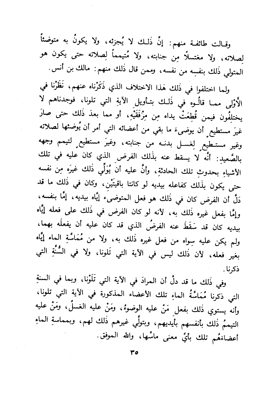 وَقَالَتْ طَائِفَةٌ مِنْهُمْ: إِنَّ ذَلِكَ لَا يُجْزِئُهُ، وَلَا يَكُونُ بِهِ مُتَوَضِّئًا لِصَلَاتِهِ، وَلَا مُغْتَسِلًا مِنْ جَنَابَتِهِ، وَلَا مُتَيَمِّمًا لِصَلَاتِهِ، حَتَّى يَكُونَ هُوَ الْمُتَوَلِّيَ ذَلِكَ بِنَفْسِهِ مِنْ نَفْسِهِ، وَمِمَّنْ قَالَ ذَلِكَ مِنْهُمْ: مَالِكُ بْنُ أَنَسٍ. وَلَمَّا اخْتَلَفُوا فِي ذَلِكَ هَذَا الِاخْتِلَافَ الَّذِي ذَكَرْنَاهُ عَنْهُمْ، نَظَرْنَا فِي الْأَوْلَى مِمَّا قَالُوهُ فِي ذَلِكَ بِتَأْوِيلِ الْآيَةِ الَّتِي تَلَوْنَا، فَوَجَدْنَاهُمْ لَا يَخْتَلِفُونَ فِيمَنْ قُطِعَتْ يَدَاهُ مِنْ مِرْفَقَيْهِ، أَوْ مِمَّا بَعْدَ ذَلِكَ حَتَّى صَارَ غَيْرَ مُسْتَطِيعٍ أَنْ يُوَضِّئَ مَا بَقِيَ مِنْ أَعْضَائِهِ الَّتِي أُمِرَ أَنْ يُوَضِّئَهَا لِصَلَاتِهِ، وَغَيْرَ مُسْتَطِيعٍ لِغَسْلِ بَدَنِهِ مِنْ جَنَابَتِهِ، وَغَيْرَ مُسْتَطِيعٍ لِتَيَمُّمِ وَجْهِهِ بِالصَّعِيدِ: أَنَّهُ لَا يَسْقُطُ عَنْهُ بِذَلِكَ الْفَرْضُ الَّذِي كَانَ عَلَيْهِ فِي تِلْكَ الْأَشْيَاءِ بِحُدُوثِ تِلْكَ الْحَادِثَةِ , وَأَنَّ عَلَيْهِ أَنْ يُوَلِّيَ ذَلِكَ غَيْرَهُ مِنْ نَفْسِهِ حَتَّى يَكُونَ بِذَلِكَ كَفَاعِلِهِ بِيَدَيْهِ لَوْ كَانَتَا بَاقِيَتَيْنِ، وَكَانَ فِي ذَلِكَ مَا قَدْ دَلَّ أَنَّ الْفَرْضَ كَانَ فِي ذَلِكَ هُوَ فِعْلَ الْمُتَوَضِّئِ إِيَّاهُ بِيَدَيْهِ، إِمَّا بِنَفْسِهِ، وَإِمَّا بِفِعْلِ غَيْرِهِ ذَلِكَ بِهِ؛ لِأَنَّهُ لَوْ كَانَ الْفَرْضُ فِي ذَلِكَ عَلَى فِعْلِهِ إِيَّاهُ بِيَدَيْهِ كَانَ قَدْ سَقَطَ عَنْهُ الْفَرْضُ الَّذِي قَدْ كَانَ عَلَيْهِ أَنْ يَفْعَلَهُ بِهِمَا، وَلَمْ يَكُنْ عَلَيْهِ سِوَاهُ مِنْ فِعْلِ غَيْرِهِ ذَلِكَ بِهِ، وَلَا مِنْ مُمَاسَّةِ الْمَاءِ إِيَّاهُ بِغَيْرِ فِعْلِهِ؛ لِأَنَّ ذَلِكَ لَيْسَ فِي الْآيَةِ الَّتِي تَلَوْنَا، وَلَا فِي السُّنَّةِ الَّتِي ذَكَرْنَا. وَفِي ذَلِكَ مَا قَدْ دَلَّ أَنَّ الْمُرَادَ فِي الْآيَةِ الَّتِي تَلَوْنَا، وَبِمَا فِي السُّنَّةِ الَّتِي ذَكَرْنَا مُمَاسَّةُ الْمَاءِ تِلْكَ الْأَعْضَاءَ الْمَذْكُورَةَ فِي الْآيَةِ الَّتِي تَلَوْنَا، وَأَنَّهُ يَسْتَوِي ذَلِكَ بِفِعْلِ مَنْ عَلَيْهِ الْوُضُوءُ، وَمَنْ عَلَيْهِ الْغُسْلُ، وَمَنْ عَلَيْهِ التَّيَمُّمُ، ذَلِكَ بِأَنْفُسِهِمْ بِأَيْدِيهِمْ، وَبِتَوَلِّي غَيْرِهِمْ ذَلِكَ لَهُمْ، وَبِمُمَاسَّةِ الْمَاءِ أَعْضَاءَهُمْ تِلْكَ بِأَيِّ مَعْنًى مَاسَّهَا، وَاللهُ الْمُوَفِّقُ