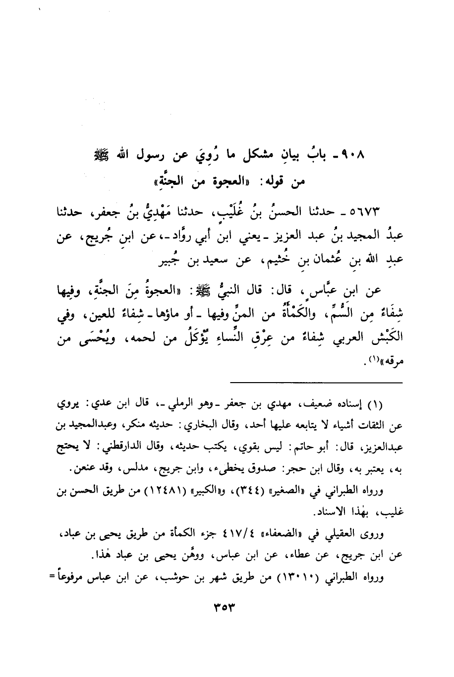 5673 - حَدَّثَنَا الْحَسَنُ بْنُ غُلَيْبٍ، حَدَّثَنَا مَهْدِيُّ بْنُ جَعْفَرٍ، حَدَّثَنَا عَبْدُ الْمَجِيدِ بْنُ عَبْدِ الْعَزِيزِ يَعْنِي ابْنَ أَبِي رَوَّادٍ، عَنِ ابْنِ جُرَيْجٍ، عَنْ عَبْدِ اللهِ بْنِ عُثْمَانَ بْنِ خُثَيْمٍ، عَنْ سَعِيدِ بْنِ جُبَيْرٍ، عَنِ ابْنِ عَبَّاسٍ قَالَ: قَالَ النَّبِيُّ صَلَّى اللَّهُ عَلَيْهِ وَسَلَّمَ: " الْعَجْوَةُ مِنَ الْجَنَّةِ، وَفِيهَا شِفَاءٌ مِنَ السُّمِّ، وَالْكَمْأَةُ مِنَ الْمَنِّ، وَفِيهَا - أَوْ مَاؤُهَا - شِفَاءٌ لِلْعَيْنِ، وَفِي الْكَبْشِ الْعَرَبِيِّ شِفَاءٌ مِنْ عِرْقِ النَّسَاءِ، يُؤْكَلُ مِنْ لَحْمِهِ، وَيُحْسَى مِنْ مَرَقِهِ "