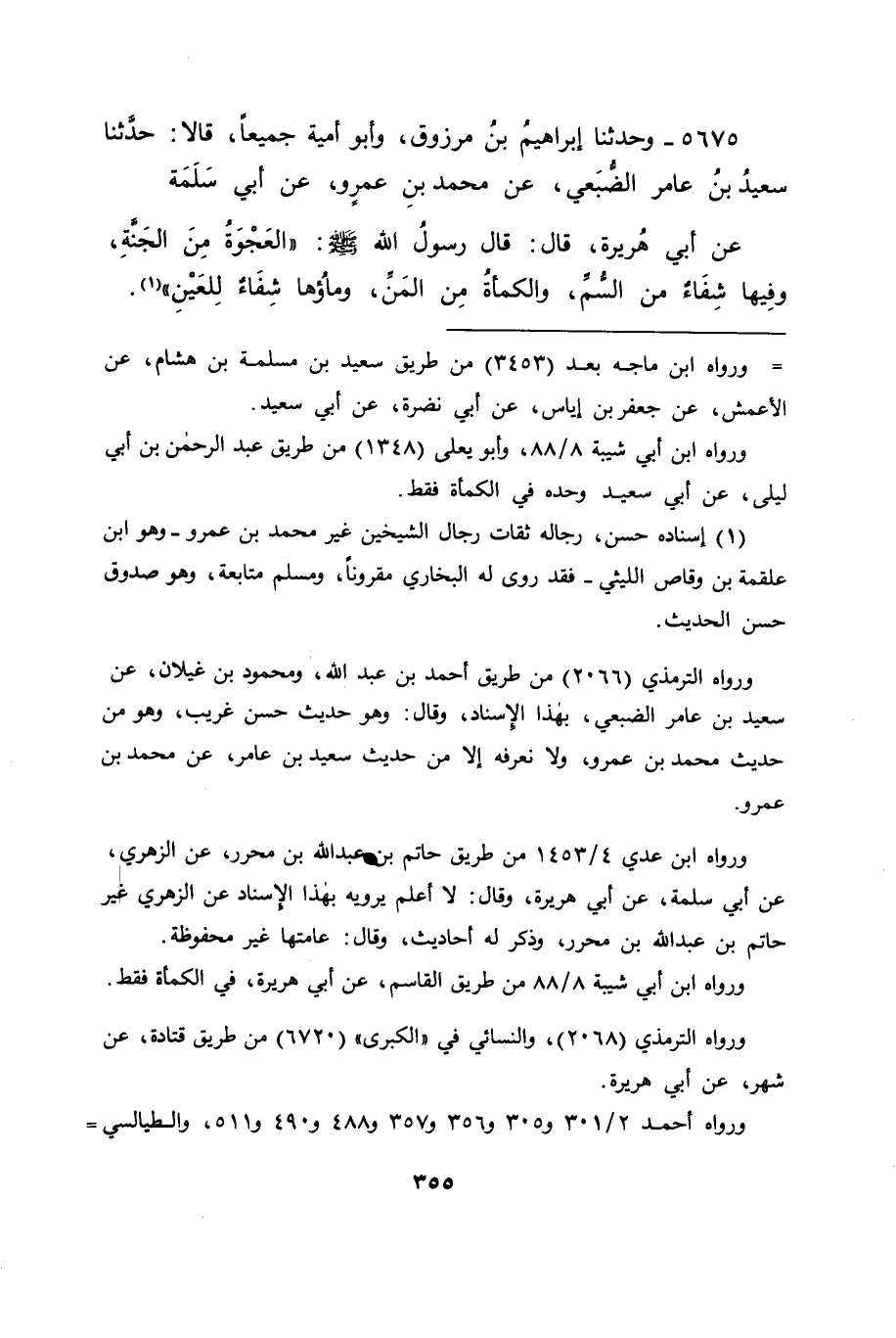 5675 - وَحَدَّثَنَا إِبْرَاهِيمُ بْنُ مَرْزُوقٍ، وَأَبُو أُمَيَّةَ، جَمِيعًا قَالَا: حَدَّثَنَا سَعِيدُ بْنُ عَامِرٍ الضُّبَعِيُّ، عَنْ مُحَمَّدِ بْنِ عَمْرٍو، عَنْ أَبِي سَلَمَةَ، عَنْ أَبِي هُرَيْرَةَ قَالَ: قَالَ رَسُولُ اللهِ صَلَّى اللَّهُ عَلَيْهِ وَسَلَّمَ: " الْعَجْوَةُ مِنَ الْجَنَّةِ، وَفِيهَا شِفَاءٌ مِنَ السُّمِّ، وَالْكَمْأَةُ مِنَ الْمَنِّ، وَمَاؤُهَا شِفَاءٌ لِلْعَيْنِ "