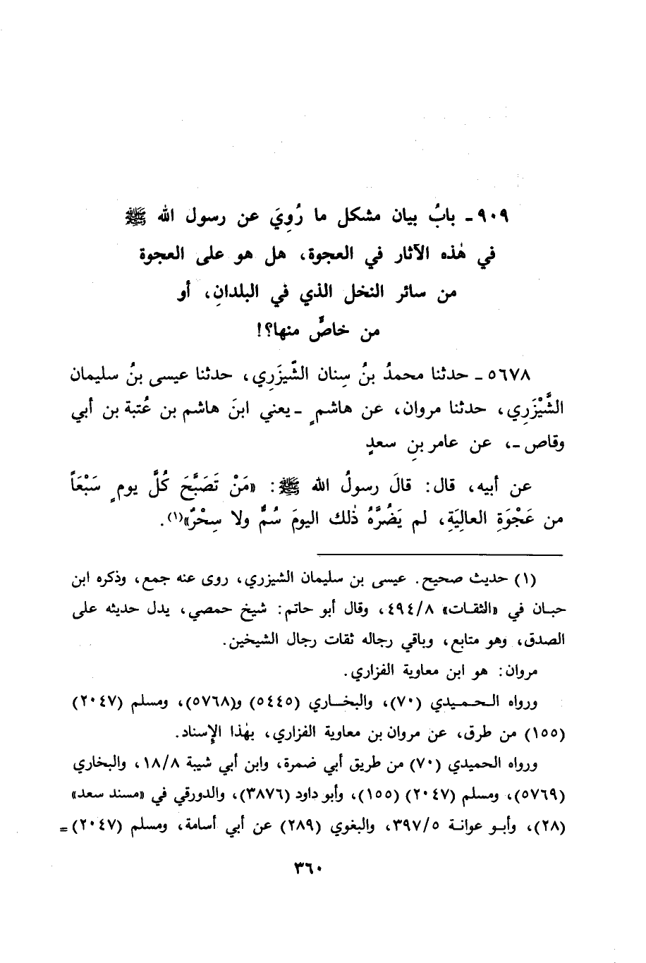 5678 - حَدَّثَنَا مُحَمَّدُ بْنُ سِنَانٍ الشَّيْزَرِيُّ، حَدَّثَنَا عِيسَى بْنُ سُلَيْمَانَ الشَّيْزَرِيُّ، حَدَّثَنَا مَرْوَانُ، عَنْ هَاشِمٍ يَعْنِي ابْنَ هَاشِمِ بْنِ عُتْبَةَ بْنِ أَبِي وَقَّاصٍ، عَنْ عَامِرِ بْنِ سَعْدٍ، عَنْ أَبِيهِ قَالَ: قَالَ رَسُولُ اللهِ صَلَّى اللَّهُ عَلَيْهِ وَسَلَّمَ: " مَنْ تَصَبَّحَ كُلَّ يَوْمٍ سَبْعًا مِنْ عَجْوَةِ الْعَالِيَةِ، لَمْ يَضُرَّهْ ذَلِكَ الْيَوْمَ سُمٌّ، وَلَا سِحْرٌ "