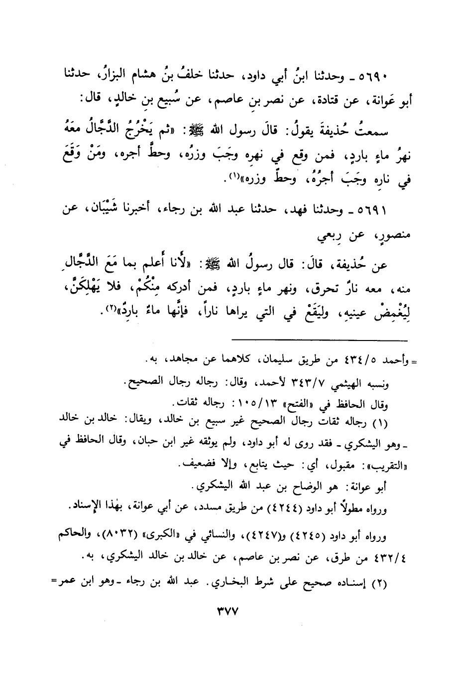 5690 - وَحَدَّثَنَا ابْنُ أَبِي دَاوُدَ، حَدَّثَنَا خَلَفُ بْنُ هِشَامٍ الْبَزَّارُ، حَدَّثَنَا أَبُو عَوَانَةَ، عَنْ قَتَادَةَ، عَنْ نَصْرِ بْنِ عَاصِمٍ، عَنْ سُبَيْعِ بْنِ خَالِدٍ قَالَ: سَمِعْتُ حُذَيْفَةَ يَقُولُ: قَالَ رَسُولُ اللهِ صَلَّى اللَّهُ عَلَيْهِ وَسَلَّمَ: " ثُمَّ يَخْرُجُ الدَّجَّالُ مَعَهُ نَهْرُ مَاءٍ بَارِدٍ، فَمَنْ وَقَعَ فِي نَهْرِهِ وَجَبَ وِزْرُهُ، وَحُطَّ أَجْرُهُ، وَمَنْ وَقَعَ فِي نَارِهِ وَجَبَ أَجْرُهُ، وَحُطَّ وِزْرُهُ "