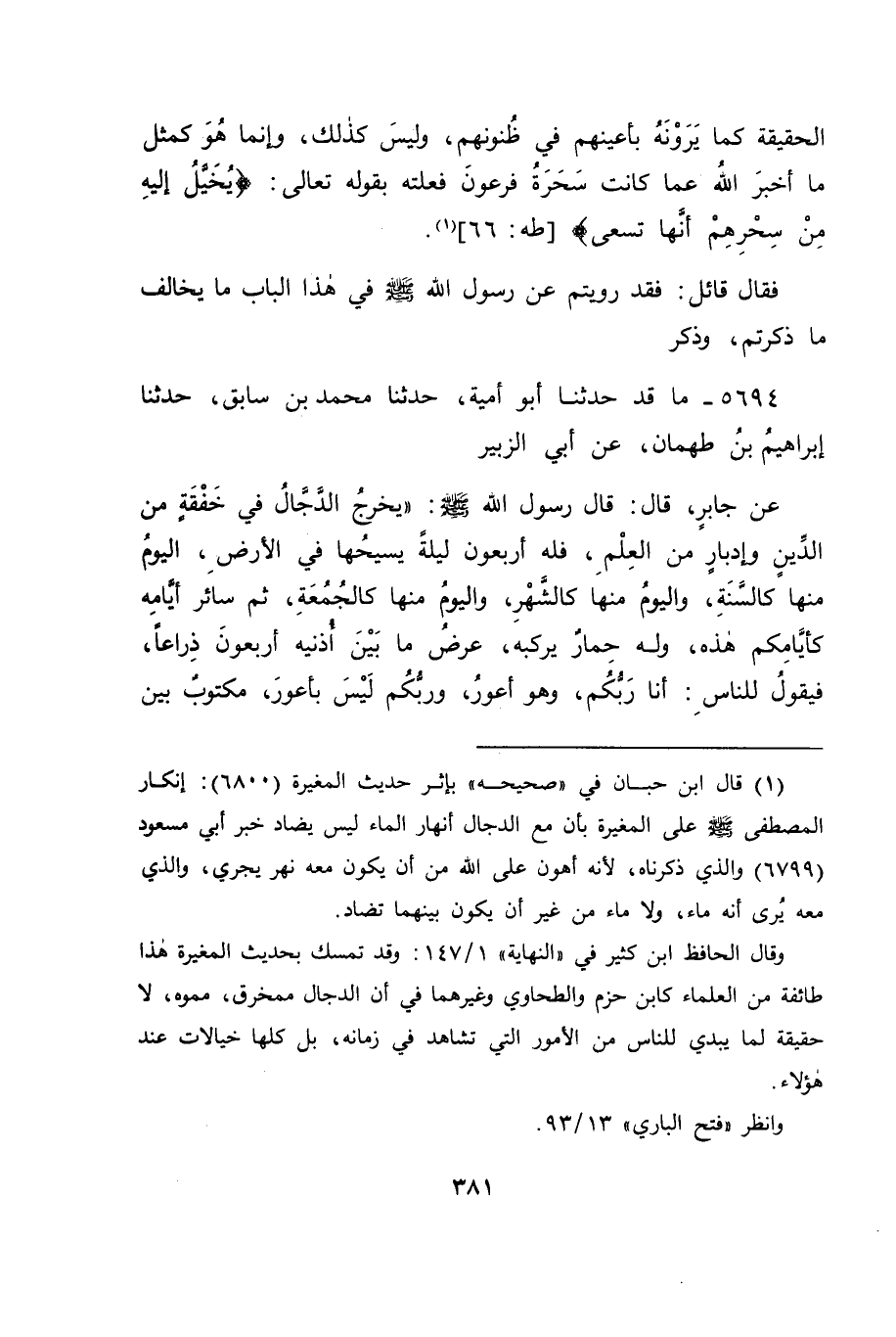5694 - مَا قَدْ حَدَّثَنَا أَبُو أُمَيَّةَ، حَدَّثَنَا مُحَمَّدُ بْنُ سَابِقٍ، حَدَّثَنَا إِبْرَاهِيمُ بْنُ طَهْمَانَ، عَنْ أَبِي الزُّبَيْرِ، عَنْ جَابِرٍ قَالَ: قَالَ رَسُولُ اللهِ صَلَّى اللَّهُ عَلَيْهِ وَسَلَّمَ: " يَخْرُجُ الدَّجَّالُ فِي خَفْقَةٍ مِنَ الدِّينِ , وَإِدْبَارٍ مِنَ الْعِلْمِ، فَلَهُ أَرْبَعُونَ لَيْلَةً يَسِيحُهَا فِي الْأَرْضِ، الْيَوْمُ مِنْهَا كَالسَّنَةِ، وَالْيَوْمُ مِنْهَا كَالشَّهْرِ، وَالْيَوْمُ مِنْهَا كَالْجُمُعَةِ، ثُمَّ سَائِرُ أَيَّامِهِ كَأَيَّامِكُمْ هَذِهِ، وَلَهُ حِمَارٌ يَرْكَبُهُ، عَرْضُ مَا بَيْنَ أُذُنَيْهِ أَرْبَعُونَ ذِرَاعًا، فَيَقُولُ لِلنَّاسِ: أَنَا رَبُّكُمْ، وَهُوَ أَعْوَرُ، وَرَبُّكُمْ لَيْسَ بِأَعْوَرَ، مَكْتُوبٌ بَيْنَ -[382]- عَيْنَيْهِ: كَافِرٌ، يَقْرَؤُهُ كُلُّ مُؤْمِنٍ: مِنْ كَاتِبٍ، وَغَيْرِ كَاتِبٍ، يَرِدُ كُلَّ مَاءٍ وَمَنْهَلٍ إِلَّا الْمَدِينَةَ وَمَكَّةَ، حَرَّمَهُمَا اللهُ تَعَالَى عَلَيْهِ، وَقَامَتِ الْمَلَائِكَةُ بِأَبْوَابِهَا، وَمَعَهُ جِبَالٌ مِنْ خُبْزٍ وَخُضْرَةٍ يَسِيرُ بِهَا فِي النَّاسِ، وَالنَّاسُ فِي جَهْدٍ، إِلَّا مَنِ اتَّبَعَهُ، وَمَعَهُ نَهْرَانِ , أَنَا أَعْلَمُ بِهِمَا مِنْهُ: نَهَرٌ يَقُولُ: الْجَنَّةُ، وَنَهَرٌ يَقُولُ: النَّارُ، مَنْ أُدْخِلَ الَّذِي يُسَمِّيهِ الْجَنَّةَ فَهُوَ النَّارُ، وَمَنْ أُدْخِلَ الَّذِي يُسَمِّيهِ النَّارَ فَهُوَ الْجَنَّةُ، وَيُبْعَثُ مَعَهُ شَيَاطِينُ تُكَلِّمُ النَّاسَ، وَمَعَهُ فِتْنَةٌ عَظِيمَةٌ، يَأْمُرُ السَّمَاءَ فَتُمْطِرُ فِيمَا يَرَى النَّاسُ، وَيَقْتُلُ نَفْسًا فَيُحْيِيهَا فِيمَا يَرَى النَّاسُ، فَيَقُولُ لِلنَّاسِ: هَلْ يَفْعَلُ هَذَا إِلَّا الرَّبُّ؟ فَيَفِرُّ الْمُسْلِمُونَ إِلَى جَبَلِ النَّارِ بِالشَّامِ، فَيَأْتِيهِمْ، فَيُحَاصِرُهُمْ، فَيَشْتَدُّ حِصَارُهُمْ، وَيُجْهِدُهُمْ جَهْدًا شَدِيدًا، ثُمَّ يَنْزِلُ عِيسَى، فَيُنَادِي مِنَ السَّحَرِ، فَيَقُولُ: يَا أَيُّهَا النَّاسُ، مَا يَمْنَعُكُمْ أَنْ تَخْرُجُوا إِلَى الْكَذَّابِ الْخَبِيثِ؟ فَيَقُولُونَ: هَذَا رَجُلٌ جِنِّيٌّ، فَيَطَّلِعُونَ فَإِذَا هُمْ بِعِيسَى ابْنِ مَرْيَمَ صَلَوَاتُ اللهِ عَلَيْهِ، فَتُقَامُ الصَّلَاةُ، فَيُقَالَ: تَقَدَّمْ يَا رُوحَ اللهِ، فَيَقُولُ: لِيَتَقَدَّمْ إِمَامُكُمْ فَيُصَلِّي بِكُمْ، فَإِذَا صَلَّى صَلَاةَ الصُّبْحِ، خَرَجُوا إِلَيْهِ، فَحِينَ رَآهُ الْكَذَّابُ يَنْمَاثُ كَمَا يَنْمَاثُ الْمِلْحُ فِي الْمَاءِ، فَيَمْشِي إِلَيْهِ، فَيَقْتُلُهُ، وَمَنْ كَانَ مَعَهُ عَلَى الْيَهُودِيَّةِ، حَتَّى إِنَّ الشَّجَرُ وَالْحَجَرُ يُنَادِي ". ثُمَّ قَطَعَ الْحَدِيثَ -[383]- قَالَ هَذَا الْقَائِلُ: فَفِي هَذَا الْحَدِيثِ تَحْقِيقُ هَذِهِ الْأَشْيَاءِ، أَنَّهَا تَكُونُ مِنَ الدَّجَّالِ. فَكَانَ جَوَابَنَا لَهُ فِي ذَلِكَ: أَنَّ فِيَ هَذَا الْحَدِيثِ مَا يَدُلُّ عَلَى غَيْرِ مَا ظَنَّ، وَذَلِكَ أَنَّ فِيهِ: " ثُمَّ يَأْمُرُ السَّمَاءَ فَتُمْطِرُ فِيمَا يَرَى النَّاسُ، وَيَقْتُلُ نَفْسًا، ثُمَّ يُحْيِيهَا فِيمَا يَرَى النَّاسُ "، وَفِي ذَلِكَ تَحْقِيقُ مَا قُلْنَا: إِنَّ هَذِهِ الْأَشْيَاءَ إِنَّمَا تَكُونُ مِنْهُ عَلَى جِهَةِ السِّحْرِ الَّذِي يُخَيَّلُ إِلَى مَنْ لَحِقَهُ ذَلِكَ السِّحْرُ أَنَّهَا حَقَائِقُ، وَلَيْسَتْ بِحَقَائِقَ، وَفِي هَذَا الْبَابِ أَيْضًا آثَارٌ كَثِيرَةٌ مِنْ هَذَا الْجِنْسِ تَرَكْنَا شَيْئًا مِنْهَا خَوْفَ طُولِ الْكِتَابِ بِهَا، تَرْجِعُ مَعَانِيهَا الَّتِي فِيهَا إِلَى مَعَانِي مَا ذَكَرْنَاهُ، وَأَنَّ ذَلِكَ كُلَّهُ عَلَى السِّحْرِ لَا عَلَى الْحَقِيقَةِ، وَنَعُوذُ بِاللهِ مِنْ ذَلِكَ