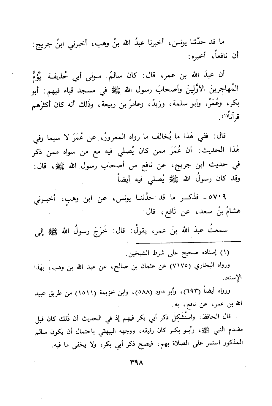 5709 - فَذَكَرَ مَا قَدْ حَدَّثَنَا يُونُسُ، عَنِ ابْنِ وَهْبٍ، أَخْبَرَنِي هِشَامُ بْنُ سَعْدٍ، عَنْ نَافِعٍ قَالَ: سَمِعْتُ عَبْدَ اللهِ بْنَ عُمَرَ يَقُولُ: قَالَ: " خَرَجَ رَسُولُ اللهِ صَلَّى اللَّهُ عَلَيْهِ وَسَلَّمَ إِلَى -[399]- قُبَاءَ، فَسَمِعَتْ بِهِ الْأَنْصَارُ، فَجَاءُوا يُسَلِّمُونَ عَلَيْهِ، فَقُلْتُ لِبِلَالٍ أَوْ صُهَيْبٍ: كَيْفَ رَأَيْتَ رَسُولَ اللهِ صَلَّى اللَّهُ عَلَيْهِ وَسَلَّمَ يَرُدُّ عَلَيْهِمْ وَهُوَ يُصَلِّي؟ قَالَ: يُشِيرُ بِيَدِهِ "