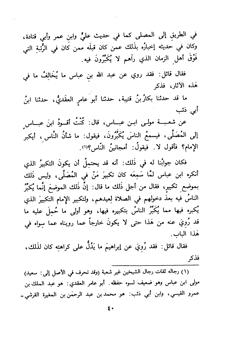 فَذَكَرَ مَا قَدْ حَدَّثَنَا بَكَّارُ بْنُ قُتَيْبَةَ، حَدَّثَنَا أَبُو عَامِرٍ الْعَقَدِيُّ، حَدَّثَنَا ابْنُ أَبِي ذِئْبٍ، عَنْ شُعْبَةَ مَوْلَى ابْنِ عَبَّاسٍ قَالَ: كُنْتُ أَقُودُ ابْنَ عَبَّاسٍ إِلَى الْمُصَلَّى، فَيَسْمَعُ النَّاسَ يُكَبِّرُونَ، فَيَقُولُ: " مَا شَأْنُ النَّاسِ، أَيُكَبِّرُ الْإِمَامُ؟، فَأَقُولُ: لَا، فَيَقُولُ: أَمَجَانِينُ النَّاسُ؟ " فَكَانَ جَوَابَنَا لَهُ فِي ذَلِكَ: أَنَّهُ قَدْ يُحْتَمَلُ أَنْ يَكُونَ التَّكْبِيرُ الَّذِي أَنْكَرَهُ ابْنُ عَبَّاسٍ - لَمَّا سَمِعَهُ - كَانَ تَكْبِيرَ مَنْ فِي الْمُصَلَّى، وَلَيْسَ ذَلِكَ بِمَوْضِعِ تَكْبِيرٍ، فَقَالَ مِنْ أَجْلِ ذَلِكَ مَا قَالَ. إِنَّ ذَلِكَ الْمَوْضِعَ إِنَّمَا يُكَبِّرُ النَّاسُ فِيهِ بَعْدَ دُخُولِهِمْ فِي الصَّلَاةِ لِعِيدِهِمْ، وَلِتَكْبِيرِ الْإِمَامِ التَّكْبِيرَ الَّذِي يُكَبِّرُهُ فِيهَا، مِمَّا يُكَبِّرُ النَّاسُ بِتَكْبِيرِهِ فِيهَا، وَهُوَ أَوْلَى مَا حُمِلَ عَلَيْهِ مَا قَدْ رُوِيَ عَنْهُ مِنْ هَذَا، حَتَّى لَا يَكُونَ خَارِجًا عَمَّا رَوَيْنَاهُ عَمَّا سِوَاهُ فِي هَذَا الْبَابِ. فَقَالَ قَائِلٌ: فَقَدْ رُوِيَ عَنْ إِبْرَاهِيمَ مَا يَدُلُّ عَلَى كَرَاهَتِهِ كَانَ لِذَلِكَ