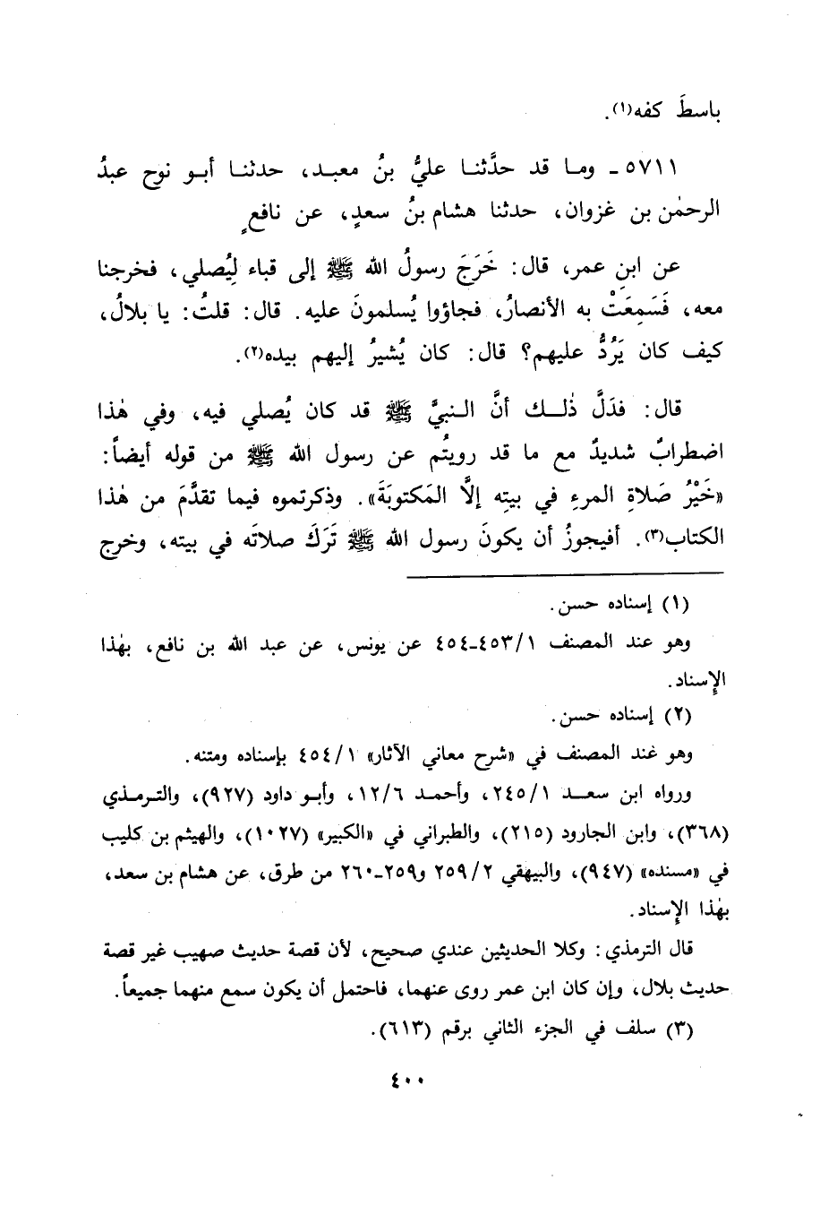 5711 - وَمَا قَدْ حَدَّثَنَا عَلِيُّ بْنُ مَعْبَدٍ، حَدَّثَنَا أَبُو نُوحٍ عَبْدُ الرَّحْمَنِ بْنُ غَزْوَانَ، حَدَّثَنَا هِشَامُ بْنُ سَعْدٍ، عَنْ نَافِعٍ، عَنِ ابْنِ عُمَرَ قَالَ: " خَرَجَ رَسُولُ اللهِ صَلَّى اللَّهُ عَلَيْهِ وَسَلَّمَ إِلَى قُبَاءَ لِيُصَلِّيَ، فَخَرَجْنَا مَعَهُ، فَسَمِعَتْ بِهِ الْأَنْصَارُ، فَجَاءُوا يُسَلِّمُونَ عَلَيْهِ قَالَ: قُلْتُ: يَا بِلَالُ، كَيْفَ كَانَ يَرُدُّ عَلَيْهِمْ؟ قَالَ: كَانَ يُشِيرُ إِلَيْهِمْ بِيَدِهِ " قَالَ: فَدَلَّ ذَلِكَ أَنَّ النَّبِيَّ صَلَّى اللَّهُ عَلَيْهِ وَسَلَّمَ قَدْ كَانَ يُصَلِّي فِيهِ، وَفِي هَذَا اضْطِرَابٌ شَدِيدٌ مَعَ مَا قَدْ رَوَيْتُمْ عَنْ رَسُولِ اللهِ صَلَّى اللَّهُ عَلَيْهِ وَسَلَّمَ مِنْ قَوْلِهِ أَيْضًا: " خَيْرُ صَلَاةِ الْمَرْءِ فِي بَيْتِهِ إِلَّا الْمَكْتُوبَةَ ". وَذَكَرْتُمُوهُ فِيمَا تَقَدَّمَ مِنْ هَذَا الْكِتَابِ، أَفَيَجُوزُ أَنْ يَكُونَ رَسُولُ اللهِ صَلَّى اللَّهُ عَلَيْهِ وَسَلَّمَ تَرَكَ صَلَاتَهُ فِي بَيْتِهِ، وَخَرَجَ -[401]- إِلَى مَسْجِدِ قُبَاءَ لِلصَّلَاةِ فِيهِ، وَتِلْكَ الصَّلَاةُ تَطَوُّعٌ، فَيَتْرُكُ الْأَفْضَلَ مَعَ تَرْكِ تَجَشُّمِ الْمَسَافَةِ، وَيَمْضِي إِلَى مَا هُوَ دُونَهُ مِنْ تَجَشُّمِ الْمَصِيرِ إِلَيْهِ مَعَ بُعْدِ الْمَسَافَةِ، , وَهَذَا مِمَّا لَا خَفَاءَ بِهِ. وَكَانَ جَوَابَنَا لَهُ فِي ذَلِكَ: أَنَّهُ لَا اخْتِلَافَ فِي شَيْءٍ مِنْ هَذِهِ الْآثَارِ مِمَّا رُوِيَ فِيهَا عَنِ النَّبِيِّ صَلَّى اللَّهُ عَلَيْهِ وَسَلَّمَ، وَلَا عَنْ أَحَدٍ مِنْ أَصْحَابِهِ الْمَذْكُورِينَ فِيهَا، وَذَلِكَ أَنَّ حَدِيثَ الْمَعْرُورِ، عَنْ عُمَرَ إِنَّمَا هُوَ لِقَصْدِهِمْ كَانَ إِلَى مَوَاضِعَ لَمْ يُصَلِّ رَسُولُ اللهِ صَلَّى اللَّهُ عَلَيْهِ وَسَلَّمَ فِيهَا لِفَضْلٍ فِيهَا عَلَى مَا سِوَاهَا، وَإِنَّمَا أَدْرَكَتْهُ الصَّلَاةُ فَصَلَّى فِي الْمَوْضِعِ الَّذِي صَلَّى فِيهِ مِنْهَا , لَا لِفَضْلٍ فِي ذَلِكَ الْمَوْضِعِ عَلَى غَيْرِهِ، فَكَرِهَ عُمَرُ أَنْ يَجْعَلُوا لَهُ فَضْلًا عَلَى غَيْرِهِ، فَيَرْجِعُونَ بِذَلِكَ إِلَى مِثْلِ مَا كَانَ عَلَيْهِ مَنْ قَبْلَهُمْ مِنِ اتِّبَاعِ آثَارِ أَنْبِيَائِهِمْ حَتَّى اتَّخَذُوهَا كَنَائِسَ وَبِيَعًا، وَكَانَ مَسْجِدُ قُبَاءَ لَهُ فَضِيلَةٌ تُؤْتَى مِنْ أَجْلِهَا، وَهِيَ أَنَّ اللهَ تَعَالَى أَمَرَ فِي غَيْرِهِ مِمَّا بُنِيَ لَمَّا ذَكَرَ الَّذِينَ بَنَوْهُ أَنَّهُمْ بَنَوْهُ لَهُ لِيَكُونَ كَمِثْلِهِ، فَكَانَ مِنَ اللهِ فِيهِ مَا أَنْزَلَ فِي كِتَابِهِ مِنْ إِظْهَارِهِ , وَمَا بَنَوْهُ لَهُ مِنْ إِرَادَتِهِمُ التَّفْرِيقَ بَيْنَ الْمُؤْمِنِينَ، وَمِنْ تَرْكِهِ مَسْجِدَ قُبَاءَ، وَإِقْرَارِهِ عَلَى مَا كَانَ عَلَيْهِ، وَلَمْ يَكُنْ ذَلِكَ إِلَّا لِفَضِيلَةٍ فِيهِ، وَرِضًى مِنَ اللهِ تَعَالَى لِمَا بَنَاهُ أَهْلُهُ مِنْ أَجْلِهِ، ثُمَّ جَهَدَهُمْ عَلَى ذَلِكَ بِمَا قَدْ ذَكَرَهُ فِي كِتَابِهِ مِنْ حَمْدِهِ إِيَّاهُمْ بِقَوْلِهِ: {فِيهِ رِجَالٌ يُحِبُّونَ أَنْ يَتَطَهَّرُوا وَاللهُ يُحِبُّ الْمُطَّهِّرِينَ} [التوبة: 108] ، فَأَمَّا الصَّلَاةُ فِيهِ، فَإِنَّهُ قَدْ يُحْتَمَلُ أَنْ يَكُونَ ذَلِكَ لِمَا وَجَبَ عَلَيْهِ صَلَّى اللَّهُ عَلَيْهِ وَسَلَّمَ أَلَّا يَجْلِسَ فِيهِ حَتَّى يَكُونَ مِنْهُ فِيهِ الصَّلَاةُ الَّتِي قَدْ أَمَرَ النَّاسَ أَنْ يَفْعَلُوهَا إِذَا دَخَلُوا الْمَسَاجِدَ قَبْلَ أَنْ يَجْلِسُوا فِيهَا