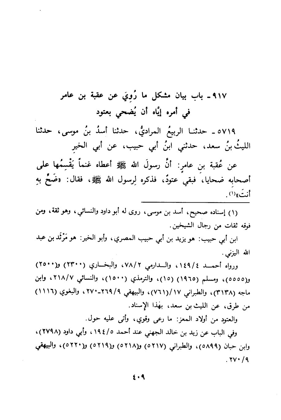 5719 - حَدَّثَنَا الرَّبِيعُ الْمُرَادِيُّ، حَدَّثَنَا أَسَدُ بْنُ مُوسَى، حَدَّثَنَا اللَّيْثُ بْنُ سَعْدٍ، حَدَّثَنِي ابْنُ أَبِي حَبِيبٍ، عَنْ أَبِي الْخَيْرِ، عَنْ عُقْبَةَ بْنِ عَامِرٍ، أَنَّ رَسُولَ اللهِ صَلَّى اللَّهُ عَلَيْهِ وَسَلَّمَ أَعْطَاهُ غَنَمًا يَقْسِمُهَا عَلَى أَصْحَابِهِ ضَحَايَا، فَبَقِيَ عَتُودٌ، فَذَكَرَهُ لِرَسُولِ اللهِ صَلَّى اللَّهُ عَلَيْهِ وَسَلَّمَ، فَقَالَ: " ضَحِّ بِهِ أَنْتَ " -[410]- فَقَالَ قَائِلٌ: كَيْفَ تَقْبَلُونَ هَذَا؟ وَالْعَتُودُ، فَإِنَّمَا هُوَ مِنْ صَغِيرِ أَوْلَادِ الْمَعْزِ، وَقَدْ أَجْمَعَ الْمُسْلِمُونَ أَنَّهُ لَا يُضَحَّى بِمِثْلِهِ؟ فَكَانَ جَوَابَنَا لَهُ فِي ذَلِكَ: أَنَّ ذَلِكَ كَانَ مِنْ رَسُولِ اللهِ صَلَّى اللَّهُ عَلَيْهِ وَسَلَّمَ رُخْصَةً مِنْهُ لِعُقْبَةَ بِأَنْ جَعَلَ ذَلِكَ لَهُ، لَا لِمَنْ سِوَاهُ مِنَ النَّاسِ، كَمَا جَعَلَ لِأَبِي بُرْدَةَ بْنِ نِيَارٍ أَنْ يُضَحِّيَ بِجَذَعٍ مِنَ الْمَعْزِ، عَلَى أَنَّ ذَلِكَ لَهُ خَاصَّةً، وَعَلَى أَنْ لَا يُجْزِئَ عَنْ أَحَدٍ بَعْدَهُ، وَقَدْ ذَكَرْنَا حَدِيثَ أَبِي بُرْدَةَ هَذَا فِيمَا تَقَدَّمَ مِنَّا فِي كِتَابِنَا هَذَا. فَقَالَ قَائِلٌ: فَقَدْ رُوِيَ هَذَا الْحَدِيثُ عَنْ عُقْبَةَ بْنِ عَامِرٍ بِخِلَافِ مَا فِي هَذَا الْحَدِيثِ الَّذِي ذَكَرْتَهُ فِي هَذَا الْبَابِ، وَذَكَرَ