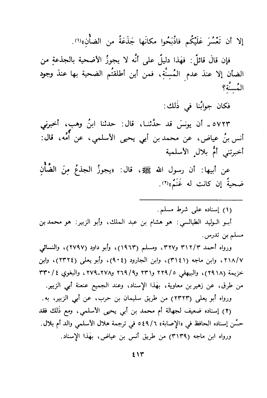 5723 - أَنَّ يُونُسَ قَدْ حَدَّثَنَا قَالَ: حَدَّثَنَا ابْنُ وَهْبٍ، أَخْبَرَنِي أَنَسُ بْنُ عِيَاضٍ، عَنْ مُحَمَّدِ بْنِ أَبِي يَحْيَى الْأَسْلَمِيِّ، عَنْ أُمِّهِ قَالَ: أَخْبَرَتْنِي أُمُّ بِلَالٍ الْأَسْلَمِيَّةُ، عَنْ أَبِيهَا، أَنَّ رَسُولَ اللهِ صَلَّى اللَّهُ عَلَيْهِ وَسَلَّمَ قَالَ: " يَجُوزُ الْجَذَعُ مِنَ الضَّأْنِ ضَحِيَّةً إِنْ كَانَتْ لَهُ غَنَمٌ " -[415]- فَفِي هَذَا إِبَاحَةُ الضَّحِيَّةِ بِالْجَذَعِ مِنَ الضَّأْنِ عَلَى كُلِّ الْأَحْوَالِ. وَقَالَ قَائِلٌ: قَدْ رُوِيَ عَنْ عُقْبَةَ: أَنَّ الَّذِي كَانَ أَمَرَهُ رَسُولُ اللهِ صَلَّى اللَّهُ عَلَيْهِ وَسَلَّمَ أَنْ يُضَحِّيَ بِهَا كَانَ جَذَعًا لَا مَا سِوَاهُ، وَذَكَرَ