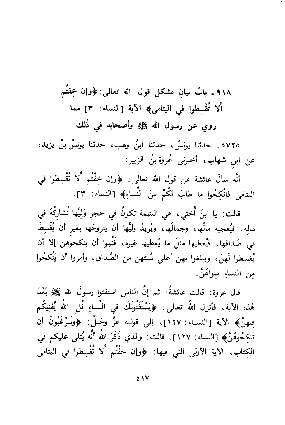 5725 - حَدَّثَنَا يُونُسُ، حَدَّثَنَا ابْنُ وَهْبٍ، حَدَّثَنَا يُونُسُ بْنُ يَزِيدَ، عَنِ ابْنِ شِهَابٍ، أَخْبَرَنِي عُرْوَةُ بْنُ الزُّبَيْرِ، أَنَّهُ سَأَلَ عَائِشَةَ عَنْ قَوْلِ اللهِ تَعَالَى: {وَإِنْ خِفْتُمْ أَلَّا تُقْسِطُوا فِي الْيَتَامَى فَانْكِحُوا مَا طَابَ لَكُمْ مِنَ النِّسَاءِ} [النساء: 3] قَالَتْ: " يَا ابْنَ أُخْتِي، هِيَ الْيَتِيمَةُ تَكُونُ فِي حِجْرِ وَلِيِّهَا تُشَارِكُهُ فِي مَالِهِ، فَيُعْجِبُهُ مَالُهَا، وَجَمَالُهَا، وَيُرِيدُ وَلِيُّهَا أَنْ يَتَزَوَّجُهَا بِغَيْرِ أَنْ يُقْسِطَ فِي صَدَاقِهَا، فَيُعْطِيهَا مِثْلَ مَا يُعْطِيهَا غَيْرُهُ، فَنُهُوا أَنْ يَنْكِحُوهُنَّ إِلَّا أَنْ يُقْسِطُوا لَهُنَّ، وَيَبْلُغُوا بِهِنَّ أَعْلَى سُنَّتِهِنَّ مِنَ الصَّدَاقِ، وَأُمِرُوا أَنْ يَنْكِحُوا مِنَ النِّسَاءِ سِوَاهُنَّ قَالَ عُرْوَةُ: قَالَتْ عَائِشَةُ: ثُمَّ إِنَّ النَّاسَ اسْتَفْتَوْا رَسُولَ اللهِ صَلَّى اللَّهُ عَلَيْهِ وَسَلَّمَ بَعْدَ هَذِهِ الْآيَةِ، فَأَنْزَلَ اللهُ تَعَالَى: {يَسْتَفْتُونَكَ فِي النِّسَاءِ قُلِ اللهُ يُفْتِيكُمْ فِيهِنَّ} [النساء: 127] الْآيَةَ، إِلَى قَوْلِهِ عَزَّ وَجَلَّ: {وَتَرْغَبُونَ أَنْ تَنْكِحُوهُنَّ} [النساء: 127] قَالَتْ: وَالَّذِي ذَكَرَ اللهُ أَنَّهُ يُتْلَى عَلَيْكُمْ فِي الْكِتَابِ، الْآيَةُ الْأُولَى الَّتِي فِيهَا: {وَإِنْ خِفْتُمْ أَلَّا تُقْسِطُوا فِي الْيَتَامَى -[418]- فَانْكِحُوا مَا طَابَ لَكُمْ مِنَ النِّسَاءِ} [النساء: 3] . قَالَتْ عَائِشَةُ: وَقَوْلُ اللهِ تَعَالَى فِي الْآيَةِ الْأُخْرَى: {وَتَرْغَبُونَ أَنْ تَنْكِحُوهُنَّ} [النساء: 127] رَغْبَةُ أَحَدِكُمْ عَنْ يَتِيمَتِهِ الَّتِي تَكُونُ فِي حِجْرِهِ حِينَ تَكُونُ قَلِيلَةَ الْمَالِ، وَالْجَمَالِ، فَنُهُوا أَنْ يَنْكِحُوا مَا رَغِبُوا فِي مَالِهَا وَجَمَالِهَا مِنْ يَتَامَى النِّسَاءِ إِلَّا بِالْقِسْطِ مِنْ أَجْلِ رَغْبَتِهِمْ عَنْهُنَّ