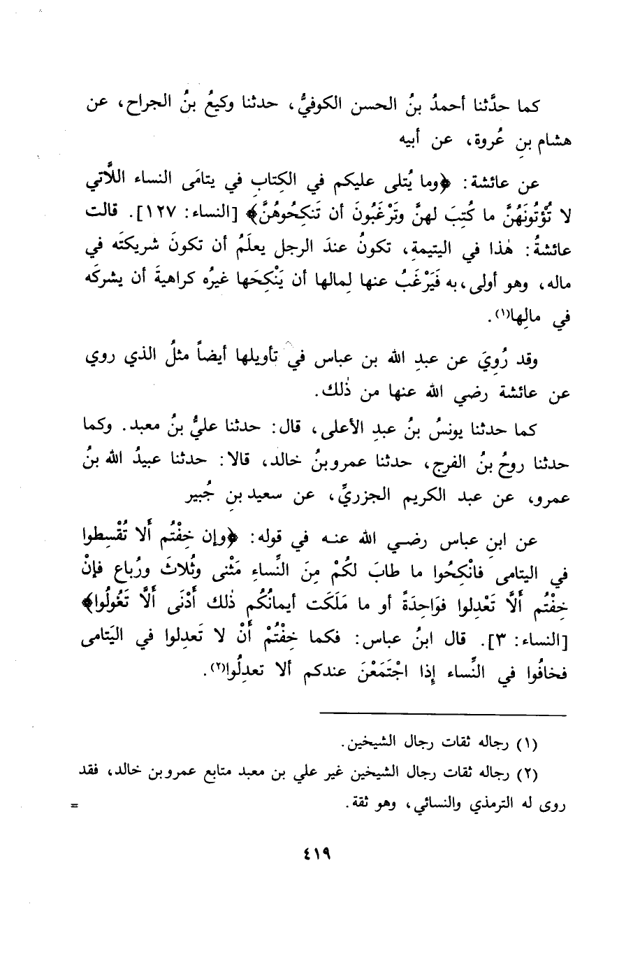 كَمَا حَدَّثَنَا أَحْمَدُ بْنُ الْحَسَنِ الْكُوفِيُّ، حَدَّثَنَا وَكِيعُ بْنُ الْجَرَّاحِ، عَنْ هِشَامِ بْنِ عُرْوَةَ، عَنْ أَبِيهِ، عَنْ عَائِشَةَ: {وَمَا يُتْلَى عَلَيْكُمْ فِي الْكِتَابِ فِي يَتَامَى النِّسَاءِ اللَّاتِي لَا تُؤْتُونَهُنَّ مَا كُتِبَ لَهُنَّ وَتَرْغَبُونَ أَنْ تَنْكِحُوهُنَّ} [النساء: 127] قَالَتْ عَائِشَةُ: هَذَا فِي الْيَتِيمَةِ، تَكُونُ عِنْدَ الرَّجُلِ يَعْلَمُ أَنْ تَكُونَ شَرِيكَتَهُ فِي مَالِهِ، وَهُوَ أَوْلَى بِهِ، فَيَرْغَبُ عَنْهَا لِمَالِهَا أَنْ يُنْكِحَهَا غَيْرَهُ كَرَاهِيَةَ أَنْ يُشْرِكَهُ فِي مَالِهَا وَقَدْ رُوِيَ عَنْ عَبْدِ اللهِ بْنِ عَبَّاسٍ فِي تَأْوِيلِهَا أَيْضًا مِثْلُ الَّذِي رُوِيَ عَنْ عَائِشَةَ رَضِيَ اللهُ عَنْهَا مِنْ ذَلِكَ