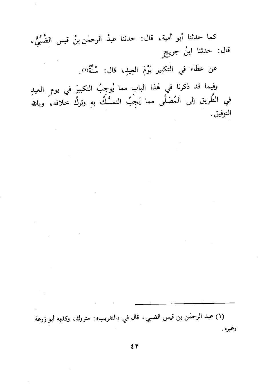 كَمَا حَدَّثَنَا أَبُو أُمَيَّةَ قَالَ: حَدَّثَنَا عَبْدُ الرَّحْمَنِ بْنُ قَيْسٍ الضَّبِّيُّ قَالَ: حَدَّثَنَا ابْنُ جُرَيْجٍ، عَنْ عَطَاءٍ فِي التَّكْبِيرِ يَوْمَ الْعِيدِ قَالَ: سُنَّةٌ وَفِيمَا قَدْ ذَكَرْنَا فِي هَذَا الْبَابِ مِمَّا يُوجِبُ التَّكْبِيرَ فِي يَوْمِ الْعِيدِ فِي الطَّرِيقِ إِلَى الْمُصَلَّى مِمَّا يَجِبُ التَّمَسُّكُ بِهِ وَتَرْكُ خِلَافِهِ، وَبِاللهِ التَّوْفِيقُ