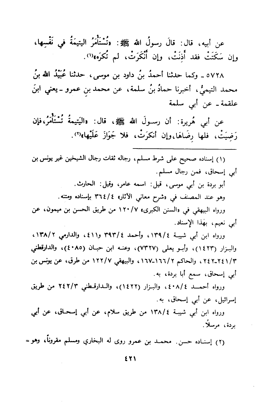 5728 - وَكَمَا حَدَّثَنَا أَحْمَدُ بْنُ دَاوُدَ بْنِ مُوسَى، حَدَّثَنَا عُبَيْدُ اللهِ بْنُ مُحَمَّدٍ التَّيْمِيُّ، أَخْبَرَنَا حَمَّادُ بْنُ سَلَمَةَ، عَنْ مُحَمَّدِ بْنِ عَمْرٍو - يَعْنِي ابْنَ عَلْقَمَةَ، عَنْ أَبِي سَلَمَةَ، عَنْ أَبِي هُرَيْرَةَ، أَنَّ رَسُولَ اللهِ صَلَّى اللَّهُ عَلَيْهِ وَسَلَّمَ قَالَ: " الْيَتِيمَةُ تُسْتَأْمَرُ، فَإِنْ رَضِيَتْ، فَلَهَا رِضَاهَا، وَإِنْ أَنْكَرَتْ، فَلَا جَوَازَ عَلَيْهَا " , -[422]-