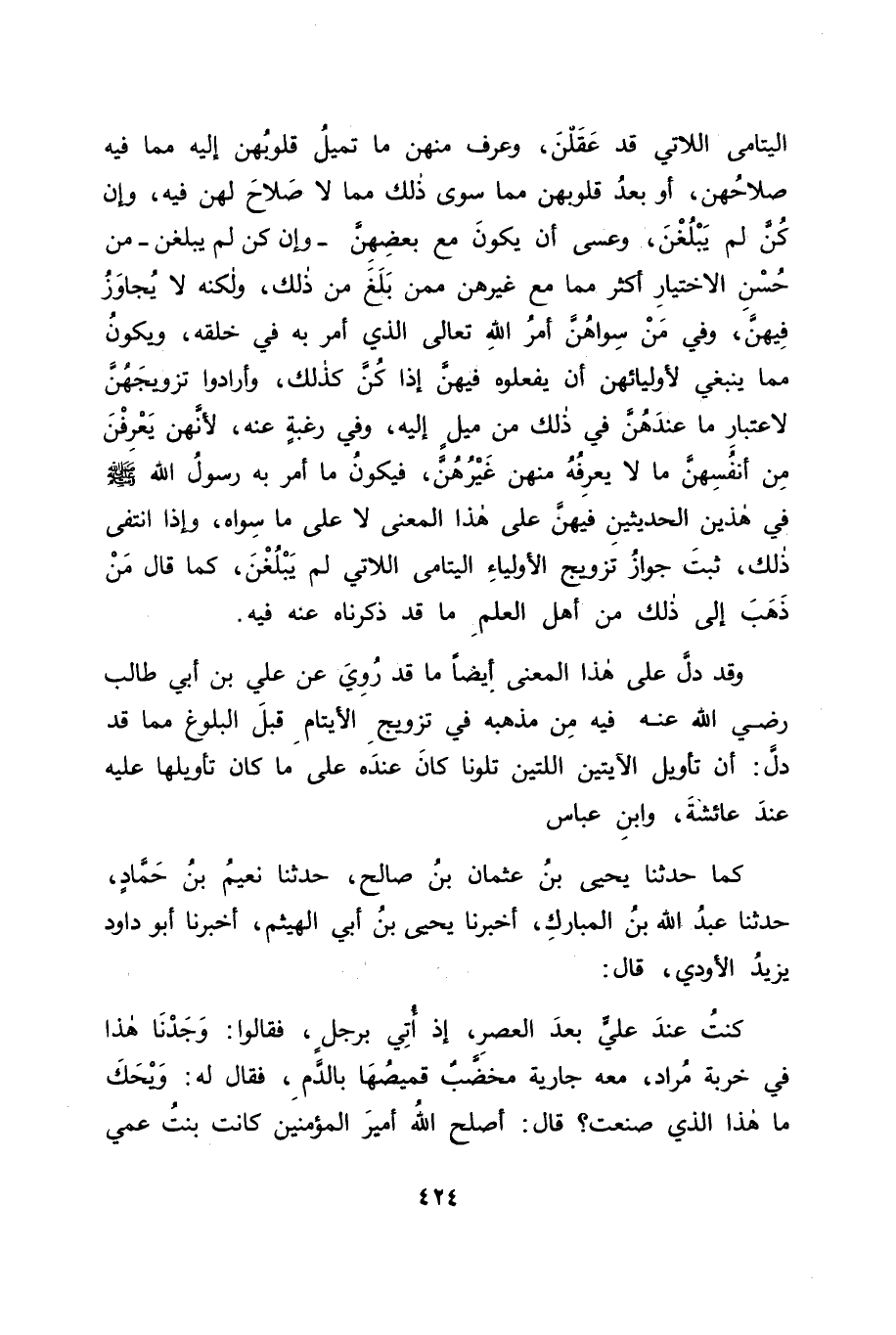 كَمَا حَدَّثَنَا يَحْيَى بْنُ عُثْمَانَ بْنِ صَالِحٍ، حَدَّثَنَا نُعَيْمُ بْنُ حَمَّادٍ، حَدَّثَنَا عَبْدُ اللهِ بْنُ الْمُبَارَكِ، أَخْبَرَنَا يَحْيَى بْنُ أَبِي الْهَيْثَمِ، أَخْبَرَنَا أَبُو دَاوُدَ يَزِيدُ الْأَوْدِيُّ قَالَ: كُنْتُ عِنْدَ عَلِيٍّ بَعْدَ الْعَصْرِ، إِذْ أُتِيَ بِرَجُلٍ، فَقَالُوا: وَجَدْنَا هَذَا فِي خَرِبَةِ مُرَادٍ، مَعَهُ جَارِيَةٌ مُخَضَّبٌ قَمِيصُهَا بِالدَّمِ، فَقَالَ لَهُ: وَيْحَكَ، مَا هَذَا الَّذِي صَنَعْتَ؟ قَالَ: أَصْلَحَ اللهُ أَمِيرَ الْمُؤْمِنِينَ , كَانَتْ بِنْتُ عَمِّي -[425]- يَتِيمَةً فِي حِجْرِي، وَهِيَ غَنِيَّةٌ فِي الْمَالِ، وَأَنَا رَجُلٌ قَدْ كَبِرْتُ , وَلَيْسَ لِي مَالٌ، فَخَشِيتُ إِنْ هِيَ أَدْرَكَتْ مَا يُدْرِكُ النِّسَاءُ تَرْغَبُ عَنِّي، فَتَزَوَّجْتُهَا قَالَ: وَهِيَ تَبْكِي. فَقَالَ: أَتَزَوَّجْتِيهِ؟ فَقَائِلٌ مِنَ الْقَوْمِ عِنْدَهُ يَقُولُ لَهَا: قُولِي نَعَمْ، وَقَائِلٌ يَقُولُ لَهَا: قُولِي لَا، فَقَالَتْ: نَعَمْ , تَزَوَّجْتُهُ، فَقَالَ: " خُذْ بِيَدِ امْرَأَتِكَ " فَيَدُلُّ مَا كَانَ مِنْ عَلِيٍّ رَضِيَ اللهُ عَنْهُ فِي هَذَا الْحَدِيثِ عَلَى أَنَّ تَأْوِيلَ الْآيَتَيْنِ اللَّتَيْنِ تَلَوْنَا كَمِثْلِ الَّذِي كَانَ تَأْوِيلُهُمَا عَلَيْهِ عِنْدَ عَائِشَةَ، وَابْنِ عَبَّاسٍ مِمَّا ذَكَرْنَا عَنْهُمَا. وَفِي ذَلِكَ مَا قَدْ دَلَّ عَلَى جَوَازِ نِكَاحِ الرَّجُلِ مِنْ نَفْسِهِ مَنْ هُوَ وَلِيُّهُ، كَمَا يَقُولُهُ أَبُو حَنِيفَةَ، وَمَالِكٌ وَأَصْحَابُهُمَا فِي ذَلِكَ، وَبِخِلَافِ مَنْ يَقُولُ: إِنَّ الرَّجُلَ لَا يَكُونُ مُزَوَّجًا مِنْ نَفْسِهِ , كَمَا لَا يَكُونُ بَائِعًا مِنْ نَفْسِهِ. وَفِي حَدِيثِ عَلِيٍّ الَّذِي ذَكَرْنَا مَا قَدْ دَلَّ أَنَّ قَوْلَ مَنْ إِلَيْهِ عَقْدُ تَزْوِيجٍ: قَدْ كُنْتُ عَقَدْتُهُ مُخْبِرًا بِذَلِكَ: أَنَّ الْقَوْلَ فِيهِ قَوْلُهُ، كَمَا يَقُولُ ذَلِكَ مَنْ يَقُولُهُ مِنْ أَهْلِ الْعِلْمِ، مِنْهُمْ: أَبُو يُوسُفَ، وَمُحَمَّدٌ، وَبِخِلَافِ مَا كَانَ أَبُو حَنِيفَةَ يَقُولُهُ فِيهِ، إِنَّ ذَلِكَ لَا يُقْبَلُ مِنْهُ إِلَّا بِبَيِّنَةٍ تَقُومُ عَلَيْهِ فِيهِ