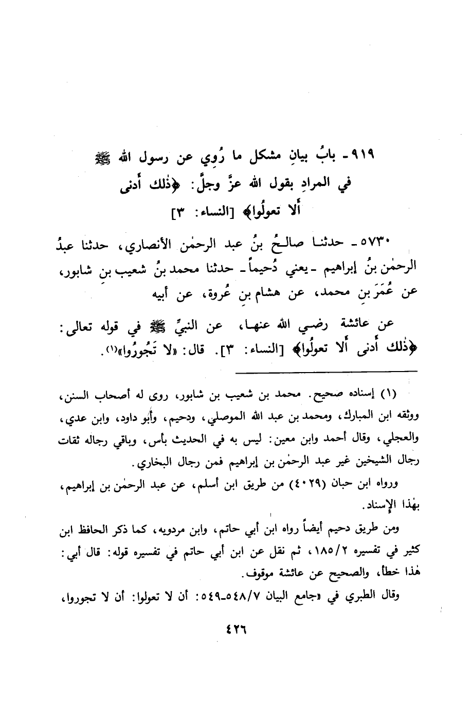 5730 - حَدَّثَنَا صَالِحُ بْنُ عَبْدِ الرَّحْمَنِ الْأَنْصَارِيُّ، حَدَّثَنَا عَبْدُ الرَّحْمَنِ بْنُ إِبْرَاهِيمَ يَعْنِي دُحَيْمًا، حَدَّثَنَا مُحَمَّدُ بْنُ شُعَيْبِ بْنِ شَابُورَ، عَنْ عُمَرَ بْنِ مُحَمَّدٍ، عَنْ هِشَامِ بْنِ عُرْوَةَ، عَنْ أَبِيهِ، عَنْ عَائِشَةَ رَضِيَ اللهُ عَنْهَا عَنِ النَّبِيِّ صَلَّى اللَّهُ عَلَيْهِ وَسَلَّمَ، فِي قَوْلِهِ تَعَالَى: " {ذَلِكَ أَدْنَى أَلَّا تَعُولُوا} [النساء: 3] قَالَ: " لَا تَجُورُوا " -[428]- وَلَا نَعْلَمُ أَحَدًا رَوَى هَذَا الْحَدِيثَ إِلَّا مِنْ هَذَا الْوَجْهِ , وَهُوَ وَجْهٌ مَحْمُودٌ؛ لِأَنَّ عُمَرَ بْنَ مُحَمَّدٍ الَّذِي دَارَ عَلَيْهِ مَعَهُ مِنَ الْجَلَّالَةِ مَا لَا خَفَاءَ بِهِ عِنْدَ أَهْلِ الْعِلْمِ، وَقَدْ حَدَّثَ عَنْهُ مَالِكٌ، وَغَيْرُ وَاحِدٍ مِنْ أَمْثَالِهِ، وَمَا حَدَّثَ ابْنُ وَهْبٍ عَنْ أَحَدٍ مِنْ أَهْلِ الْمَدِينَةِ أَجَلَّ مِنْهُ، وَهُوَ عُمَرُ بْنُ مُحَمَّدِ بْنِ زَيْدِ بْنِ عَبْدِ اللهِ بْنِ عُمَرَ بْنِ الْخَطَّابِ. وَقَدْ رُوِّينَا عَنِ ابْنِ عَبَّاسٍ فِي تَأْوِيلِهَا أَيْضًا هَذَا الْقَوْلَ بِعَيْنِهِ فِي الْبَابِ الَّذِي قَبْلَ هَذَا الْبَابِ، وَهَذَا مِمَّا لَا يُقَالُ بِالرَّأْيِ، وَإِنَّمَا يُقَالُ بِالتَّوْقِيفِ وَقَدْ رُوِيَ عَنِ ابْنِ عَبَّاسٍ مِنْ وَجْهٍ آخَرَ