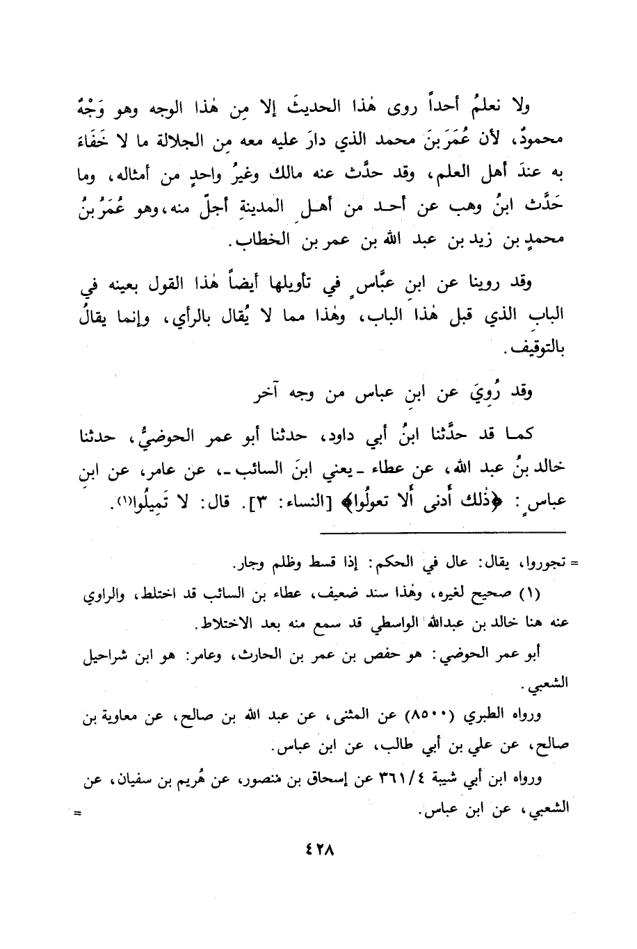 كَمَا قَدْ حَدَّثَنَا ابْنُ أَبِي دَاوُدَ، حَدَّثَنَا أَبُو عُمَرَ الْحَوْضِيُّ، حَدَّثَنَا خَالِدُ بْنُ عَبْدِ اللهِ، عَنْ عَطَاءٍ يَعْنِي ابْنَ السَّائِبِ، عَنْ عَامِرٍ، عَنِ ابْنِ عَبَّاسٍ: " {ذَلِكَ أَدْنَى أَلَّا تَعُولُوا} [النساء: 3] قَالَ: لَا تَمِيلُوا " -[429]- وَلَا نَعْلَمُهُ رُوِيَ عَنْ أَحَدٍ مِنْ أَصْحَابِ رَسُولِ اللهِ صَلَّى اللَّهُ عَلَيْهِ وَسَلَّمَ فِي تَأْوِيلِهَا غَيْرُ هَذَا الْقَوْلِ. وَقَدْ رُوِيَ عَنْ غَيْرِ وَاحِدٍ مِنَ التَّابِعِينَ فِي تَأْوِيلِهَا مِثْلُ ذَلِكَ أَيْضًا