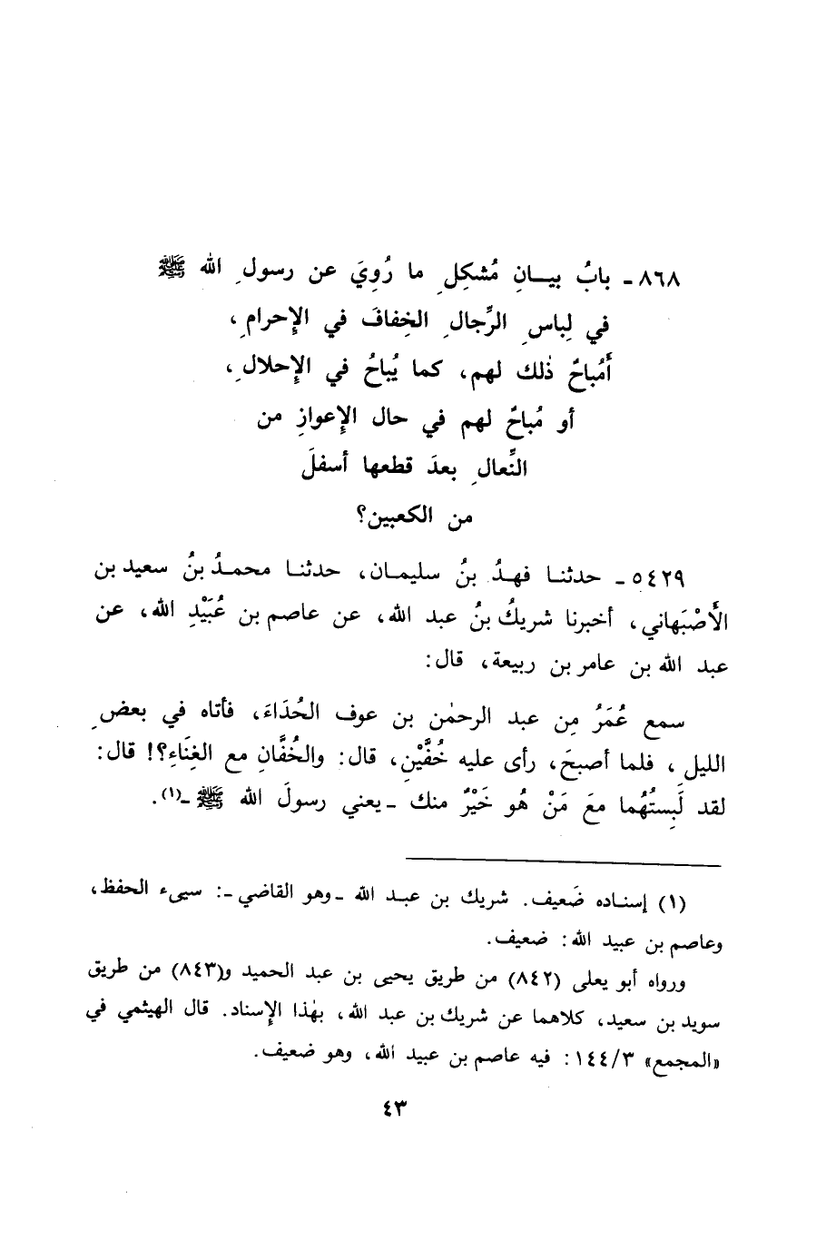 5429 - حَدَّثَنَا فَهْدُ بْنُ سُلَيْمَانَ، حَدَّثَنَا مُحَمَّدُ بْنُ سَعِيدِ بْنِ الْأَصْبَهَانِيِّ، أَخْبَرَنَا شَرِيكُ بْنُ عَبْدِ اللهِ، عَنْ عَاصِمِ بْنِ عُبَيْدِ اللهِ، عَنْ عَبْدِ اللهِ بْنِ عَامِرِ بْنِ رَبِيعَةَ قَالَ: سَمِعَ عُمَرُ، مِنْ عَبْدِ الرَّحْمَنِ بْنِ عَوْفٍ الْحُدَاءَ، فَأَتَاهُ فِي بَعْضِ اللَّيْلِ، فَلَمَّا أَصْبَحَ، رَأَى عَلَيْهِ خُفَّيْنِ قَالَ: وَالْخُفَّانِ مَعَ الْغِنَاءِ؟ قَالَ: " لَقَدْ لَبِسْتُهُمَا مَعَ مَنْ هُوَ خَيْرٌ مِنْكَ - يَعْنِي رَسُولَ اللهِ صَلَّى اللَّهُ عَلَيْهِ وَسَلَّمَ " -[44]- قَالَ أَبُو جَعْفَرٍ: فَفِي هَذَا الْحَدِيثِ إِخْبَارُ عَبْدِ الرَّحْمَنِ بْنِ عَوْفٍ عُمَرَ رَضِيَ اللهُ عَنْهُمَا: أَنَّهُ لَبِسَ الْخُفَّيْنِ - يَعْنِي فِي الْإِحْرَامِ - مَعَ مَنْ هُوَ خَيْرٌ مِنْهُ، يُرِيدُ بِهِ رَسُولَ اللهِ صَلَّى اللَّهُ عَلَيْهِ وَسَلَّمَ. فَقَالَ قَائِلٌ: هَذَا لَا حُجَّةَ فِيهِ؛ لِأَنَّهُ لَمْ يُخْبِرْ أَنَّ رَسُولَ اللهِ صَلَّى اللَّهُ عَلَيْهِ وَسَلَّمَ كَانَ قَدْ وَقَفَ عَلَى ذَلِكَ مِنْهُ، فَأَمْضَاهُ لَهُ. قَالَ: وَمِثْلُ ذَلِكَ مَا قَدْ كَانَ رِفَاعَةُ بْنُ رَافِعٍ الْأَنْصَارِيُّ ذَكَرَهُ لِعُمَرَ رَضِيَ اللهُ عَنْهُ فِي الْمَاءِ مِنَ الْمَاءِ، وَأَنَّهُمْ كَانُوا يُجَامِعُونَ عَلَى عَهْدِ رَسُولِ اللهِ صَلَّى اللَّهُ عَلَيْهِ وَسَلَّمَ، ثُمَّ لَا يَغْتَسِلُونَ إِذَا لَمْ يُنْزِلُوا، وَقَوْلُ عُمَرَ لَهُ بِهِ عِنْدَ ذَلِكَ: أَفَذَكَرْتُمْ ذَلِكَ لِرَسُولِ اللهِ صَلَّى اللَّهُ عَلَيْهِ وَسَلَّمَ فَأَقَرَّكُمْ عَلَيْهِ؟ قَالَ: لَا، فَلَمْ يَرَ عُمَرُ ذَلِكَ شَيْئًا؟ فَكَانَ جَوَابَنَا لَهُ فِي ذَلِكَ: أَنَّ الْأَمْرَ فِي ذَلِكَ كَمَا ذَكَرَ، وَلَكِنَّا قَدْ وَجَدْنَا عَنْ عَبْدِ الرَّحْمَنِ فِي ذَلِكَ مَا يَدُلُّ عَلَى وُقُوفِ رَسُولِ اللهِ صَلَّى اللَّهُ عَلَيْهِ وَسَلَّمَ كَانَ عَلَى ذَلِكَ مِنْهُ، وَتَرْكِهِ النَّكِيرَ عَلَيْهِ فِيهِ
