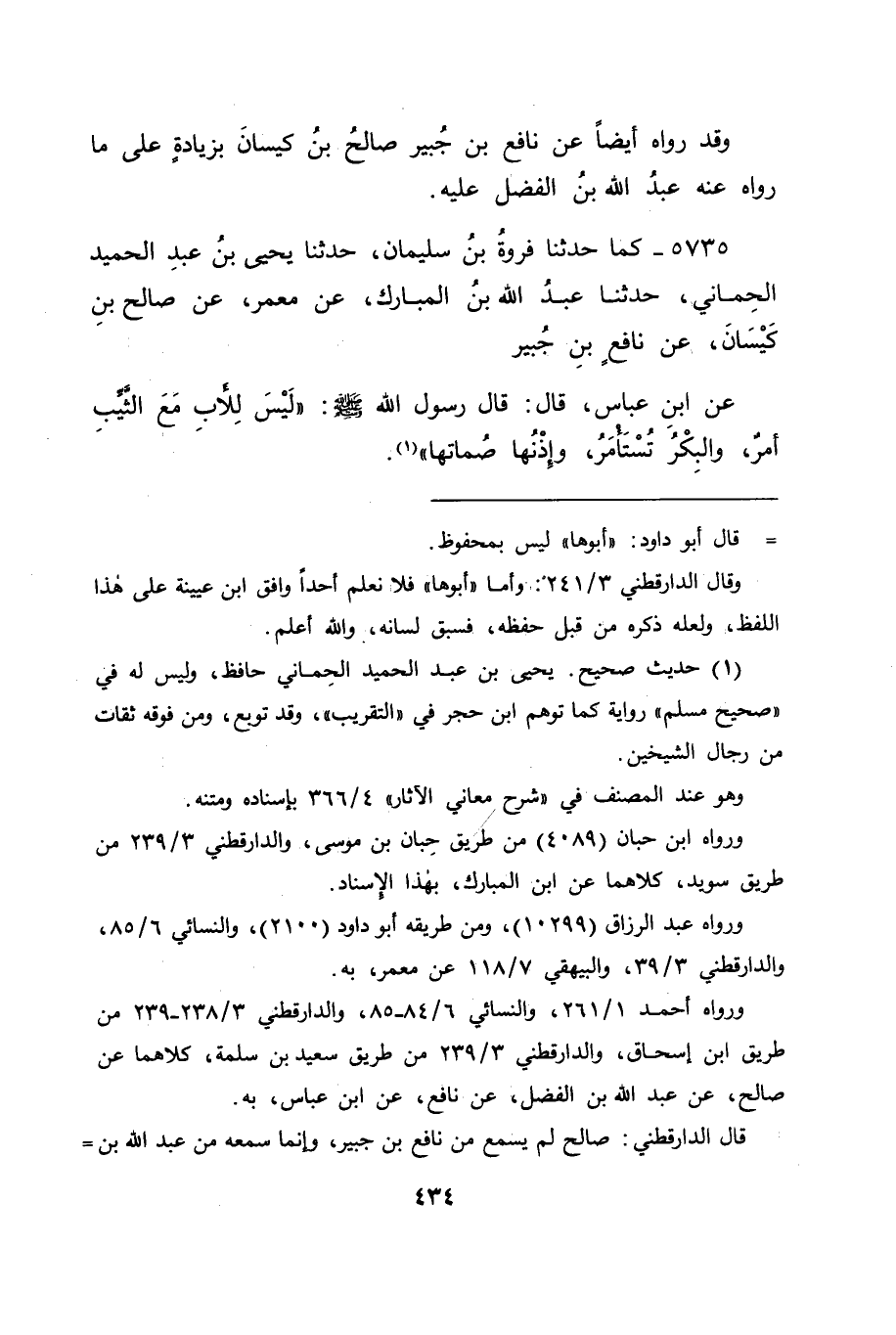 5735 - كَمَا حَدَّثَنَا فَرْوَةُ بْنُ سُلَيْمَانَ، حَدَّثَنَا يَحْيَى بْنُ عَبْدِ الْحَمِيدِ الْحِمَّانِيُّ، حَدَّثَنَا عَبْدُ اللهِ بْنُ الْمُبَارَكِ، عَنْ مَعْمَرٍ، عَنْ صَالِحِ بْنِ كَيْسَانَ، عَنْ نَافِعِ بْنِ جُبَيْرٍ، عَنِ ابْنِ عَبَّاسٍ قَالَ: قَالَ رَسُولُ اللهِ صَلَّى اللَّهُ عَلَيْهِ وَسَلَّمَ: " لَيْسَ لِلْأَبِ مَعَ الثَّيِّبِ أَمْرٌ، وَالْبِكْرُ تُسْتَأْمَرُ، وَإِذْنُهَا صُمَاتُهَا " -[435]- فَزَادَ صَالِحٌ عَلَى عَبْدِ اللهِ بْنِ الْفَضْلِ بِمَا فِي حَدِيثِهِ هَذَا: " لَيْسَ لِلْأَبِ مَعَ الثَّيِّبِ أَمْرٌ ". وَقَدْ رَوَى هَذَا الْحَدِيثَ أَيْضًا ابْنُ مَوْهَبٍ، عَنْ نَافِعِ بْنِ جُبَيْرٍ ,