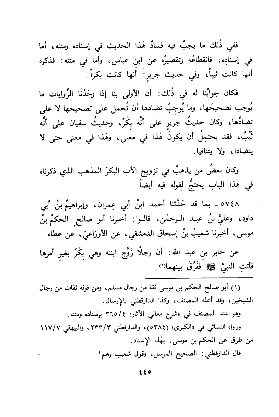 5748 - بِمَا قَدْ حَدَّثَنَا أَحْمَدُ بْنُ أَبِي عِمْرَانَ، وَإِبْرَاهِيمُ بْنُ أَبِي دَاوُدَ، وَعَلِيُّ بْنُ عَبْدِ الرَّحْمَنِ، قَالُوا: أَخْبَرَنَا أَبُو صَالِحٍ الْحَكَمُ بْنُ مُوسَى، أَخْبَرَنَا شُعَيْبُ بْنُ إِسْحَاقَ الدِّمَشْقِيُّ، عَنِ الْأَوْزَاعِيِّ، عَنْ عَطَاءٍ، عَنْ جَابِرِ بْنِ عَبْدِ اللهِ، " أَنَّ رَجُلًا زَوَّجَ ابْنَتَهُ وَهِيَ بِكْرٌ بِغَيْرِ أَمْرِهَا , فَأَتَتِ النَّبِيَّ صَلَّى اللَّهُ عَلَيْهِ وَسَلَّمَ فَفَرَّقَ بَيْنَهُمَا " -[446]- وَلَمْ يَكُنْ هَذَا الْحَدِيثُ مِمَّا يَجُوزُ لَهُ أَنْ يَحْتَجَّ بِهِ، إِذْ كَانَ أَصْلُهُ